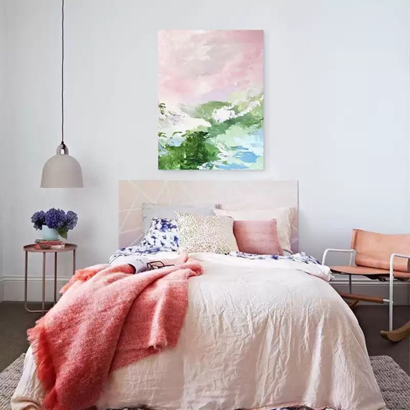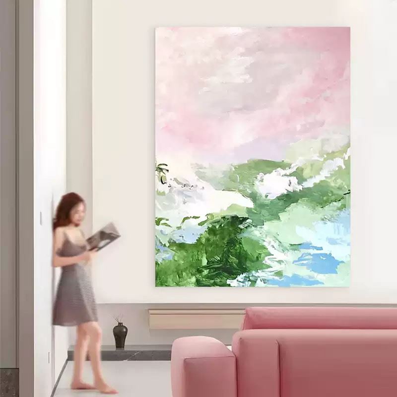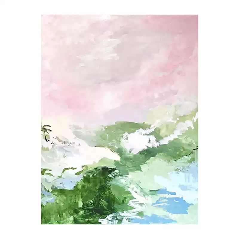 A soft pink sky spreads across the top like a dreamy curtain, while greens and pale blues mingle below in drifting slopes and reflections, as if a forest mirrored through morning mist. Blurred, fluid strokes fuse reality and dream, inviting the viewer to wander through a quiet spring landscape in a half-awake, half-dreaming state. Dimensions: 24 x 31 inches.