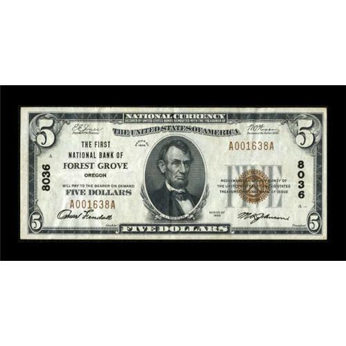 <B>Forest Grove, OR</B></I> - $5 1929 Ty. 1 <B>The First NB</B></I> Ch. # 8036<BR> A high grade example which is certain to please. Bright <B>Extremely Fine.</B></I><BR><BR><b>Shipping:</b> Coins & Currency (<a target="_blank" href="http://www.heritageauctions.com/common/shipping.php">view shipping information</a>)