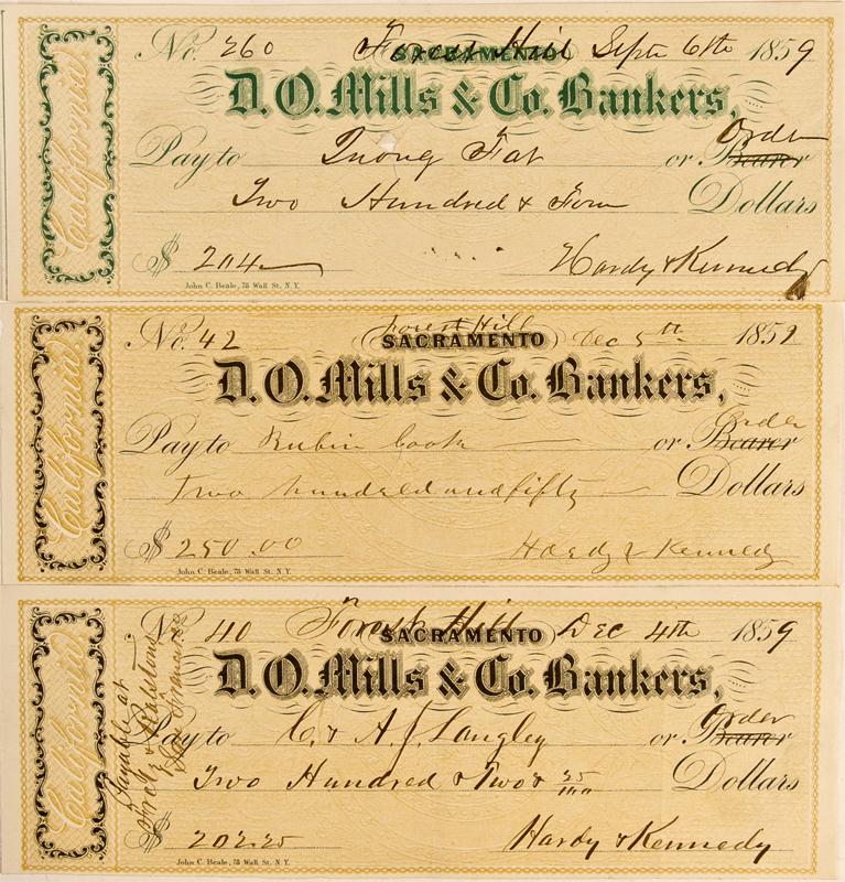 Lot of three. 1) No. 40 issued Dec. 4, 1859 to C.A. Langley (San Francisco druggists) for $202.25. Signed Hardy & Kennedy (store merchant). Endorsed on reverse. Cut cancelled at center. Black/gold on crème. 2) No. 42 issued Dec. 5, 1859 to Ruben Cook for $250. Signed Hardy and Kennedy. Endorsed on reverse. Cut cancelled at center. Black/gold on crème. 3) No. 260 issued Sept. 6, 1859 to Tuong Fia (Chinese merchant) for $214. Cut cancelled at center. Green/gold on crème. All D.O. Mills & Co. Bankers checks. Forest Hill near Auburn, CA, a notable and major gold area in Sierra range. Fine.