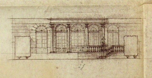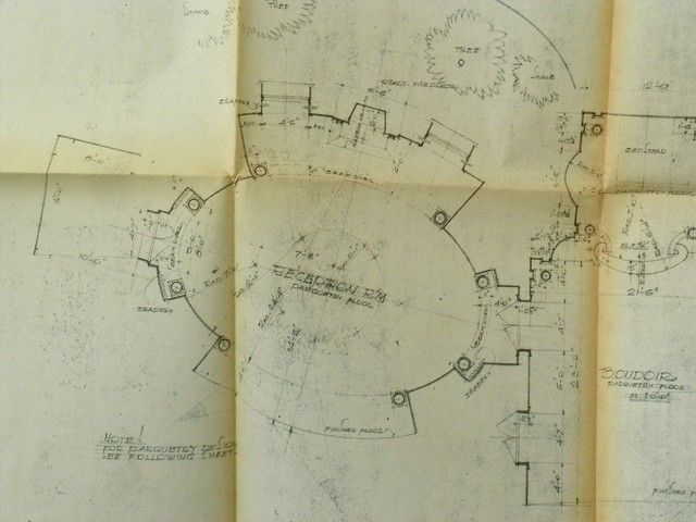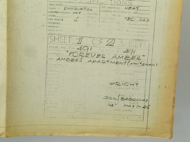 From one of the most opulent, and extremely controversial movie classics of the 1940's , "Forever Amber" (1947) , which was condemned by everyone from the Pope to the Legion of Decency for "glamorization of immorality and licentiousness", (and only added to its success and box-office). Besides its story of sin, it also was resplendent with magnificent costumes and sets. These are two very rare original production elevation drawing blueprints from Art Director Lyle Wheeler of both the front of the main mansion and set designs of that "hussy", Amber St. Clair's (Linda Darnell) apartment. Both drawings are approx. 36"x26".