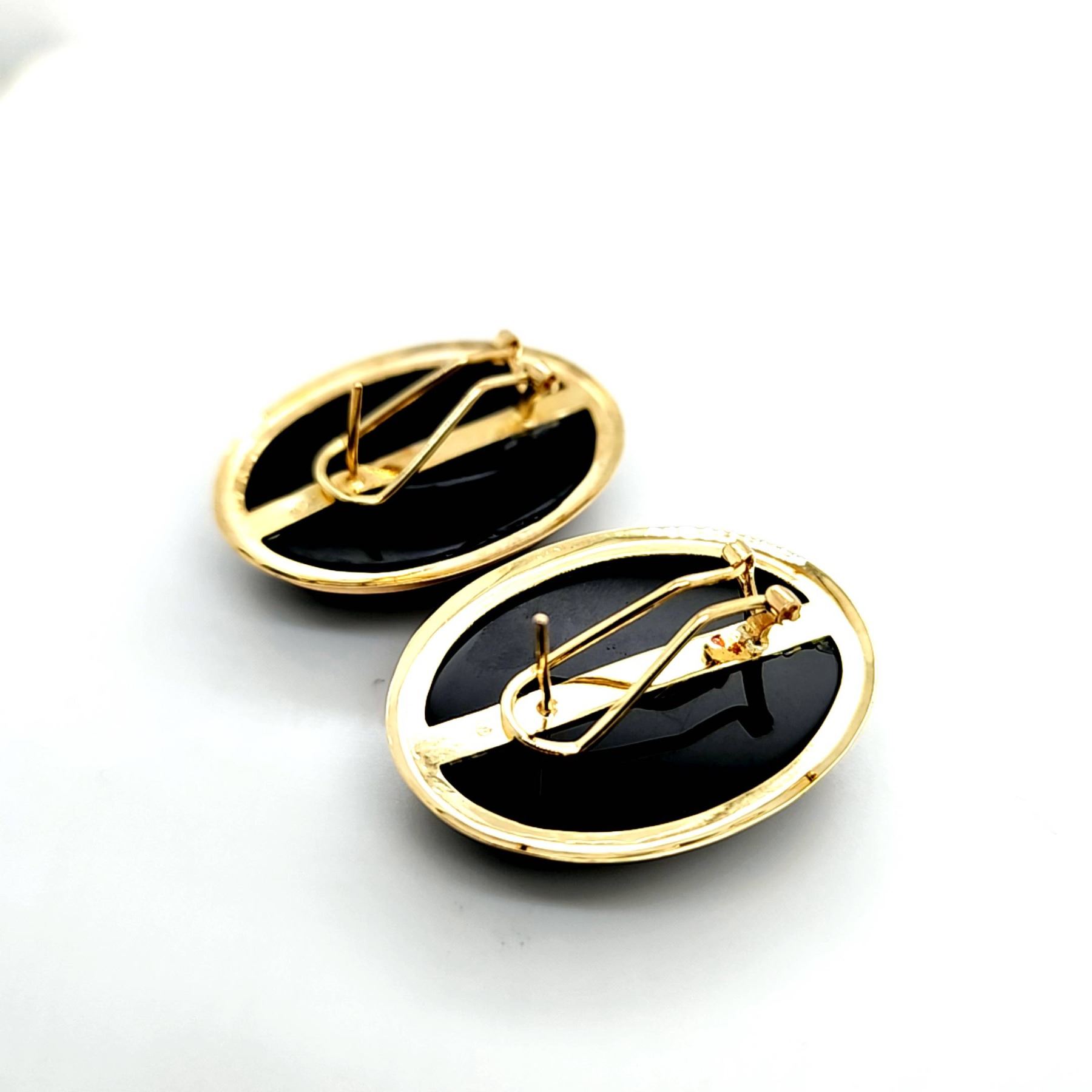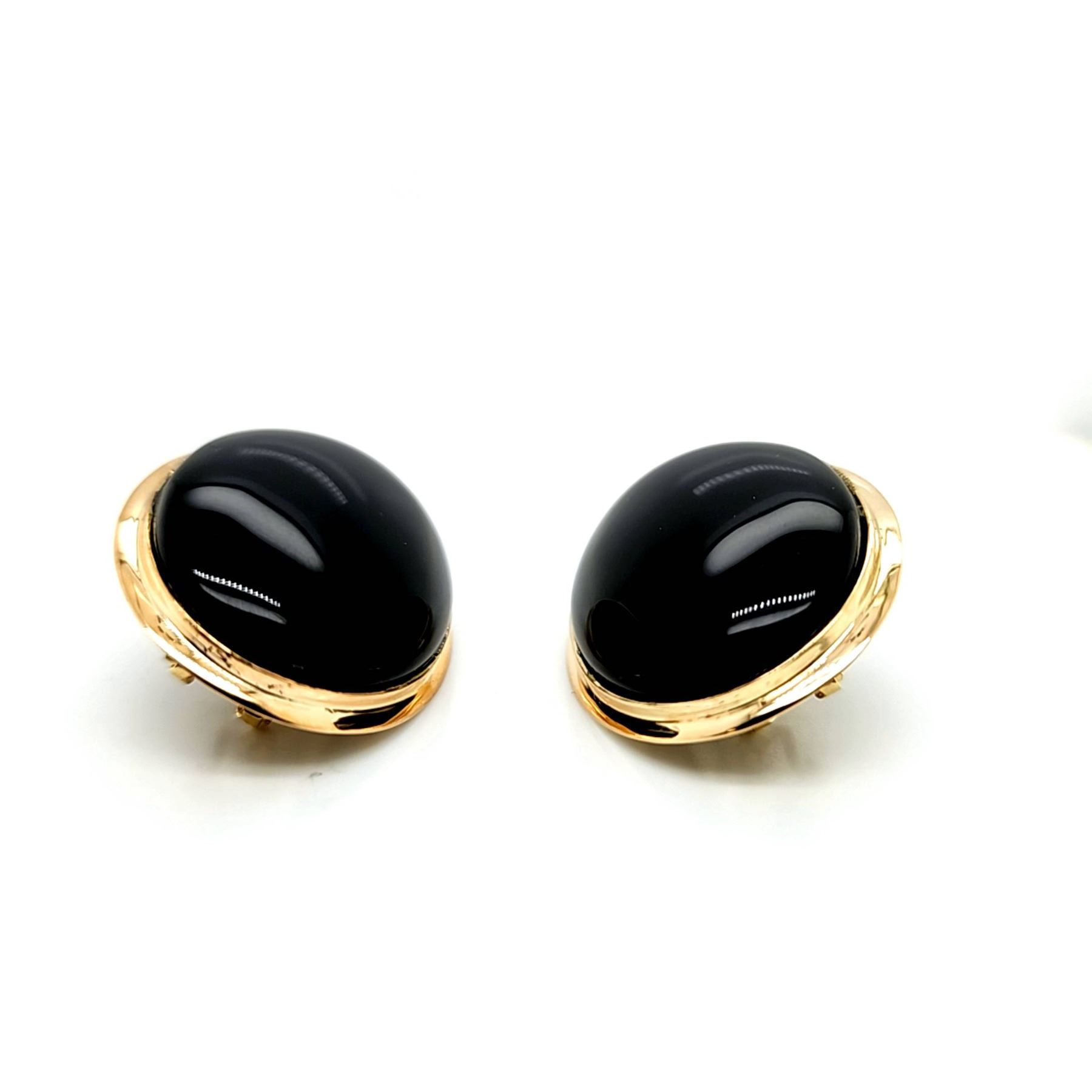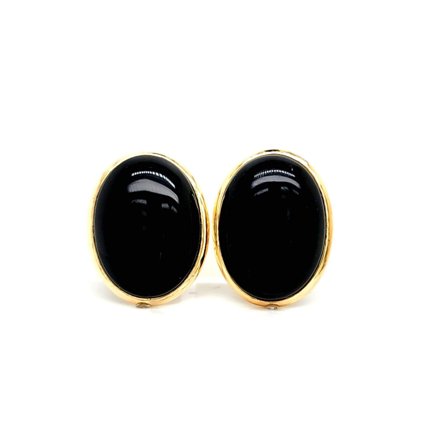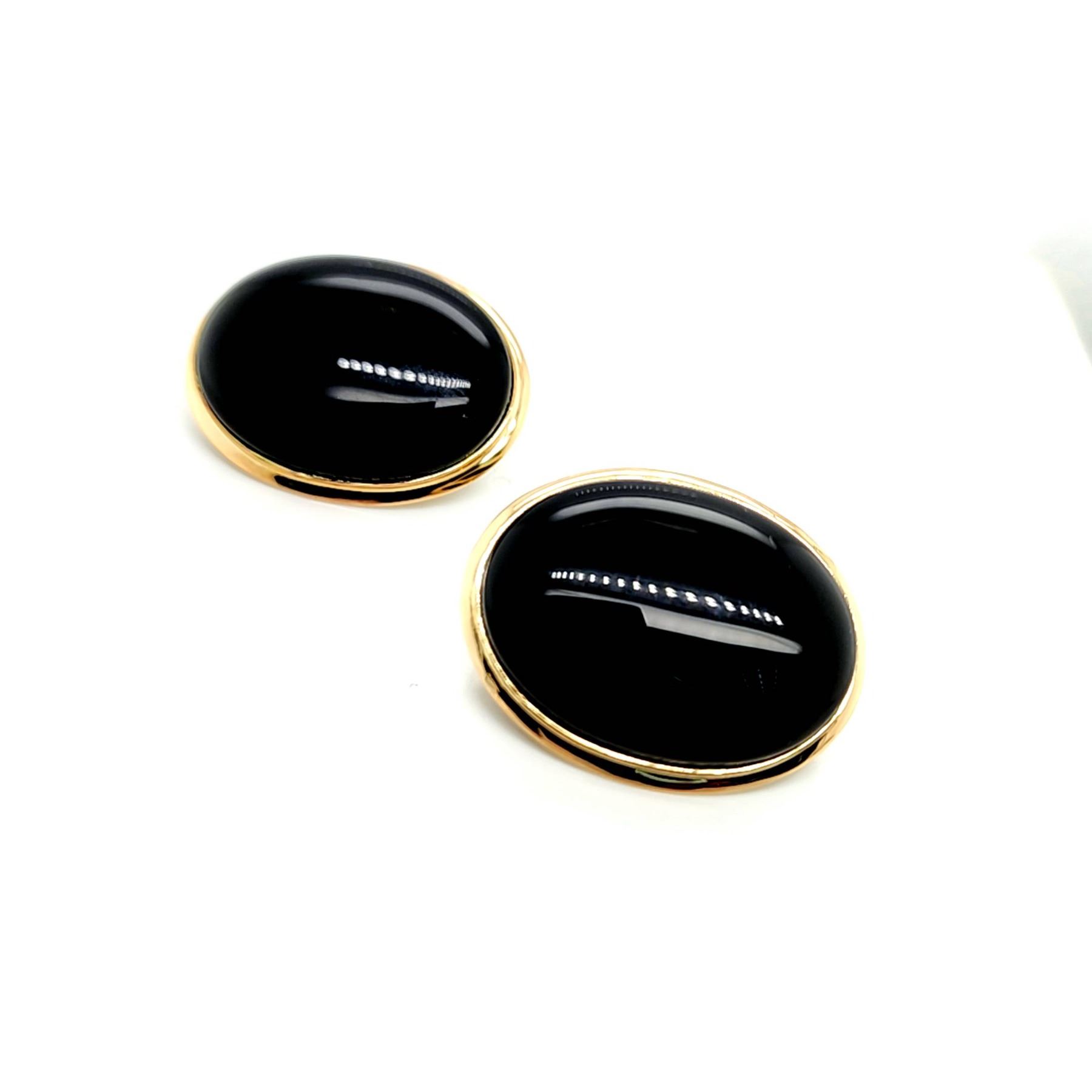Genuine Onyx Earrings. These are such classics, they never go out of style!& nbsp;& nbsp;This is a pair of extra-large, extra-chunky 14 karat yellow gold earrings featuring large cabochon black onyx.& nbsp; The earrings are approximately 1 3/8& quot; long and 1 1/16& quot; wide and 7mm thick.& nbsp; They attach to the earlobe with posts and Omega backs.& nbsp; This is a preowned, estate item in excellent condition.