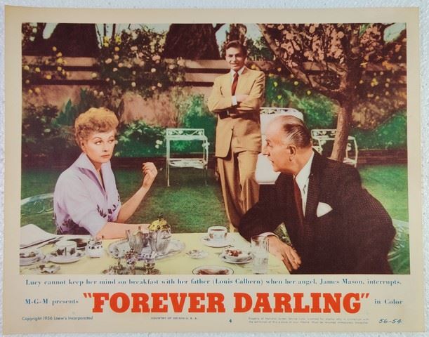 Forever Darling (MGM, Zanra Productions, 1956) lobby card. Fantasy, Comedy. Starring Lucille Ball, Desi Arnaz, James Mason, Louis Calhern, John Emery, John Hoyt, Natalie Schafer, Mabel Albertson, Ralph Dumke, Nancy Kulp, Willis Bouchey, Ruth Brady. Directed by Alexander Hall. Very light edge wear, very light creases, very light staining. Very Fine. (11"x14").