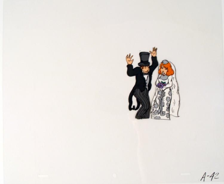 This is an original animation cel of a bride and groom. * * * * You lay a hand on me, so help my god, my father will be on you faster than you can blink your eyes... * * * Medium: Hand painted acetate cel * * Cel size: 10 1/2" x 12 1/2" * * Notations: Bottom of cel * * Condition: Excellent