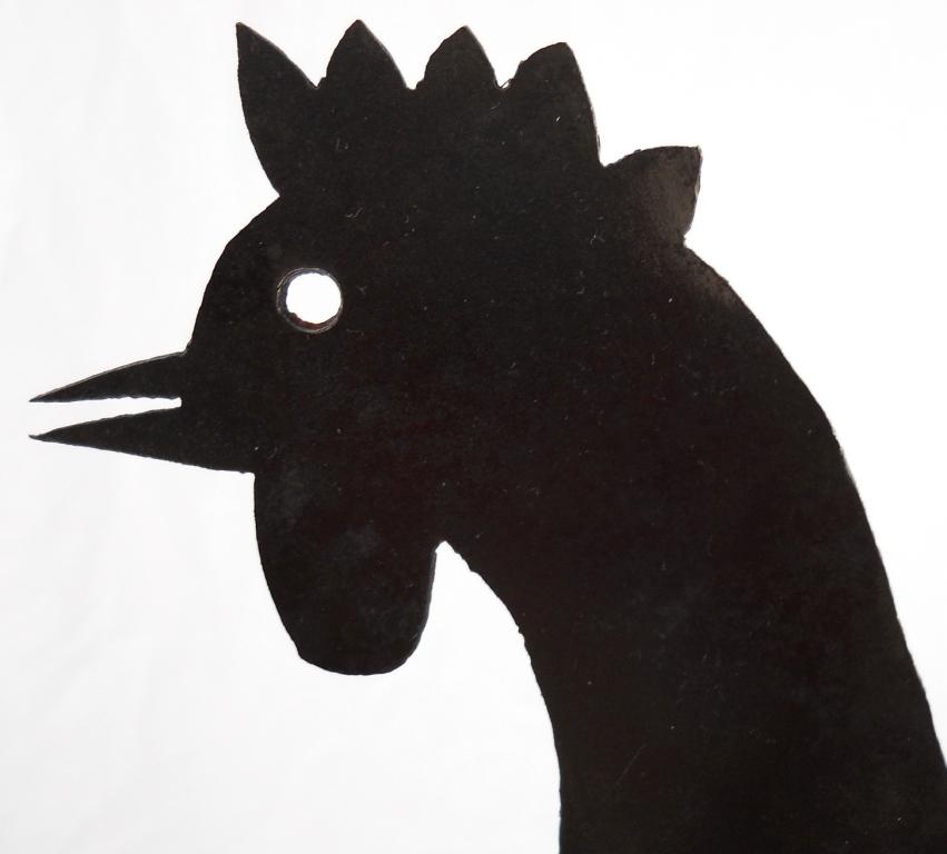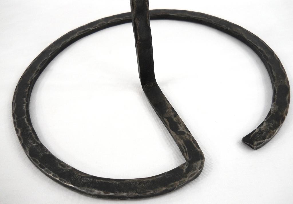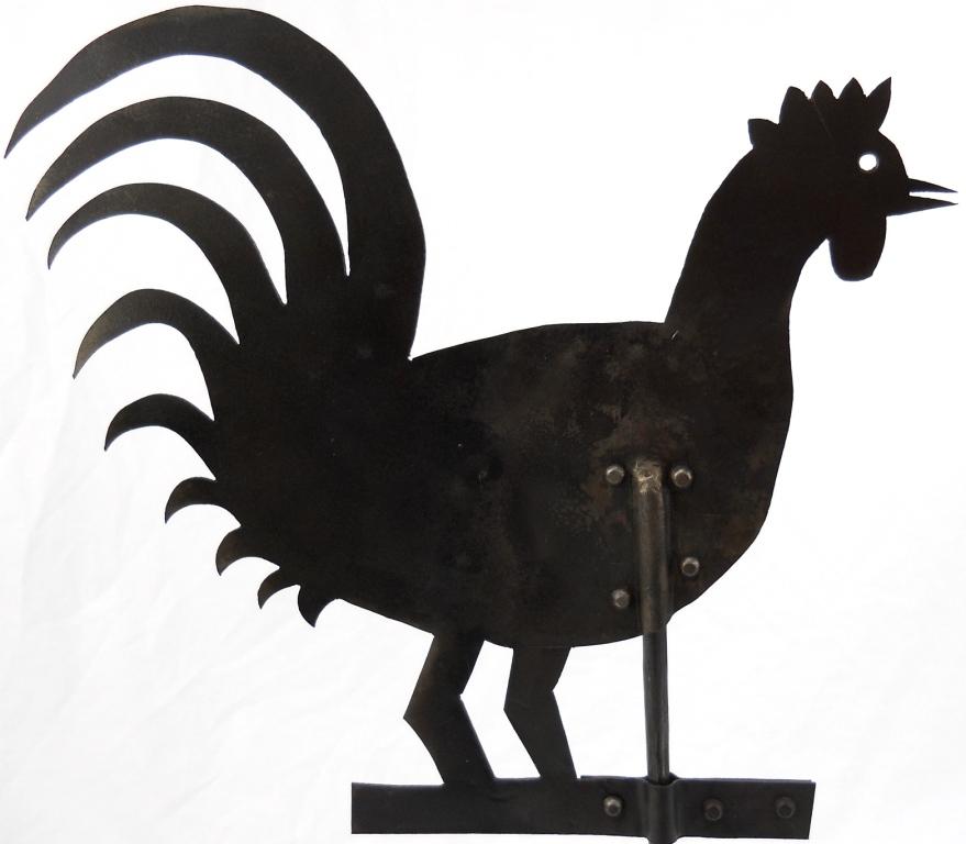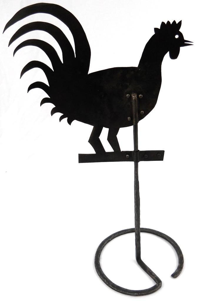 14" x 24". The consignor of this piece said about 30 years ago he was at an antique fair on Whidbey island in Washington state, and there was a blacksmith demonstrating his trade. He hand forged and hammered the stand, the rooster was already cut out, and then he combined the two pieces. When he was finished he then sold what he had made. This looks great next to a fireplace or would be a great piece to have in any farm house setting.