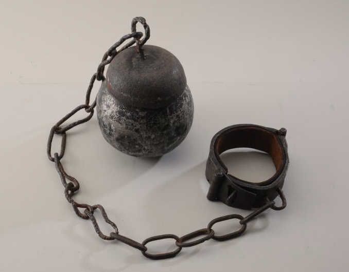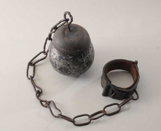 Forged iron slave shackle with ball and chain, definitely 19th century, from a Civil War collection. An original, not a reproduction. Est.: $1,000-$3,000
