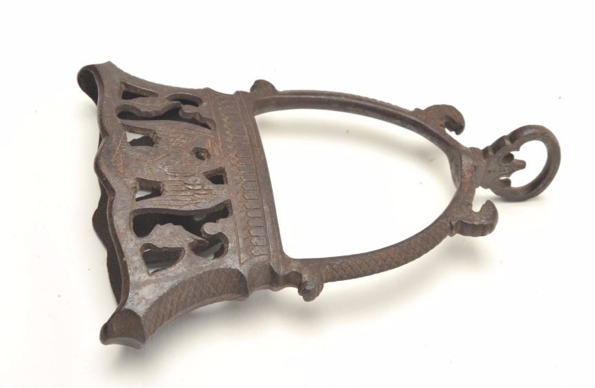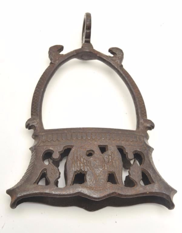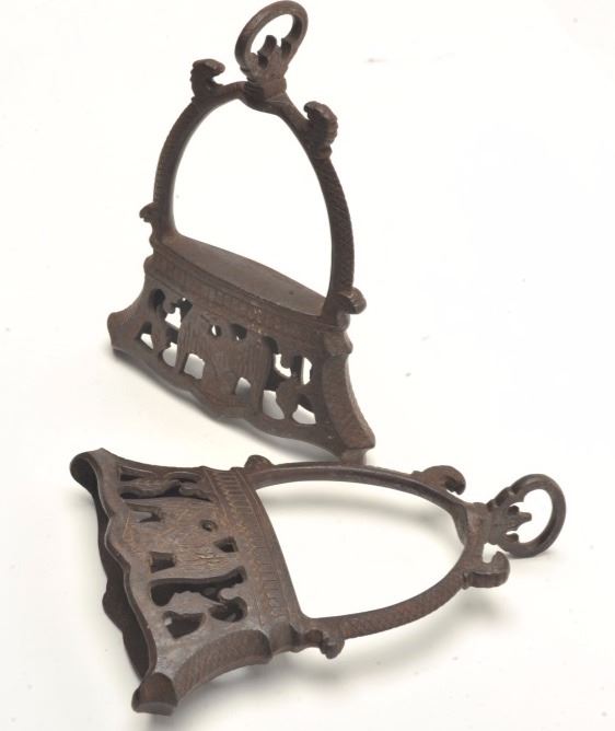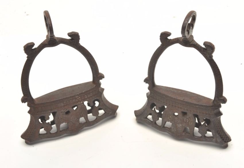 Forged iron stirrups circa 17th to early 19th century with eagle decorations probably Spanish from colonial era. Measures 8” by almost 6” across. In good condition with uncleaned rust and some minor pitting butwell defined engraving. Quality forging and constructed denoting original high cost for important personage. The central mounted eagle faces left and is surrounded by cut and pierce work. Est.: $600-$1200