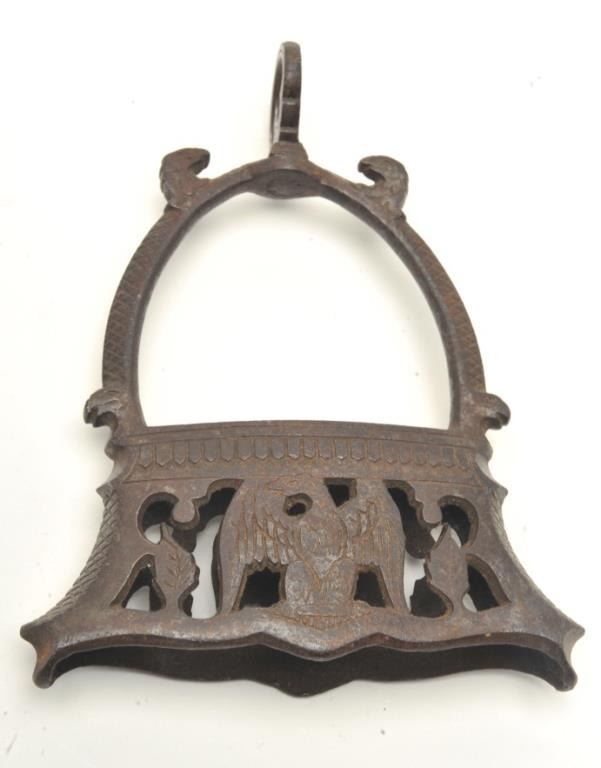 Forged iron stirrups circa 17th to early 19th century with eagle decorations probably Spanish from colonial era. Measures 8” by almost 6” across. In good condition with uncleaned rust and some minor pitting butwell defined engraving. Quality forging and constructed denoting original high cost for important personage. The central mounted eagle faces left and is surrounded by cut and pierce work. Est.: $300-600
