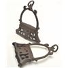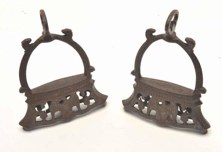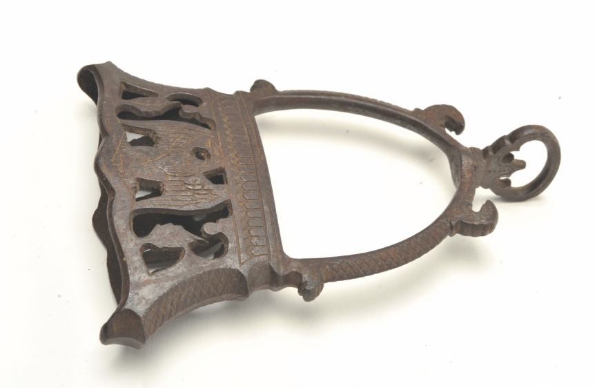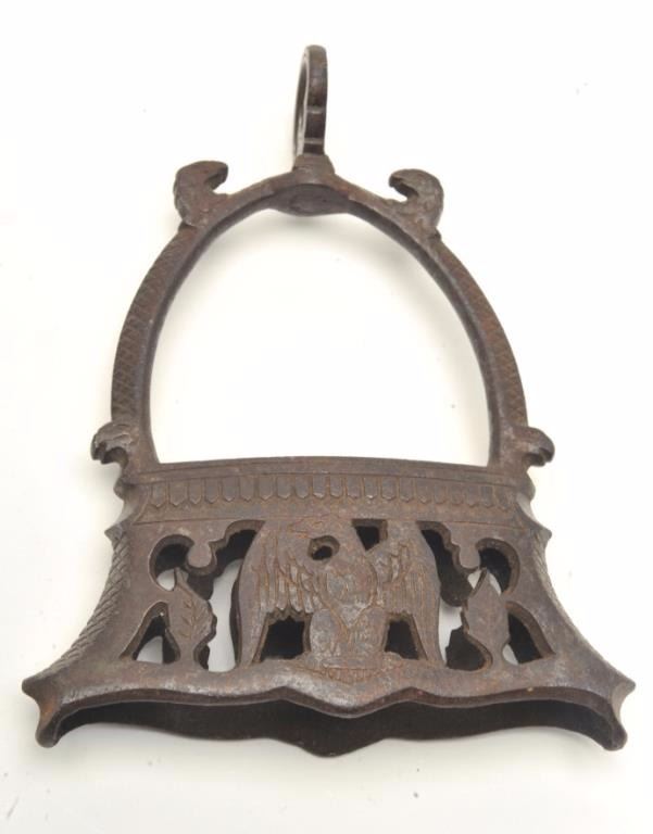 century with eagle decorations probably Spanish from colonial era. Measures 8” by almost 6” across. In good condition with uncleaned rust and some minor pitting but well defined engraving. Quality forging and constructed denoting original high cost for important personage. The central mounted eagle faces left and is surrounded by cut and pierce work. Est.: $600-$1200