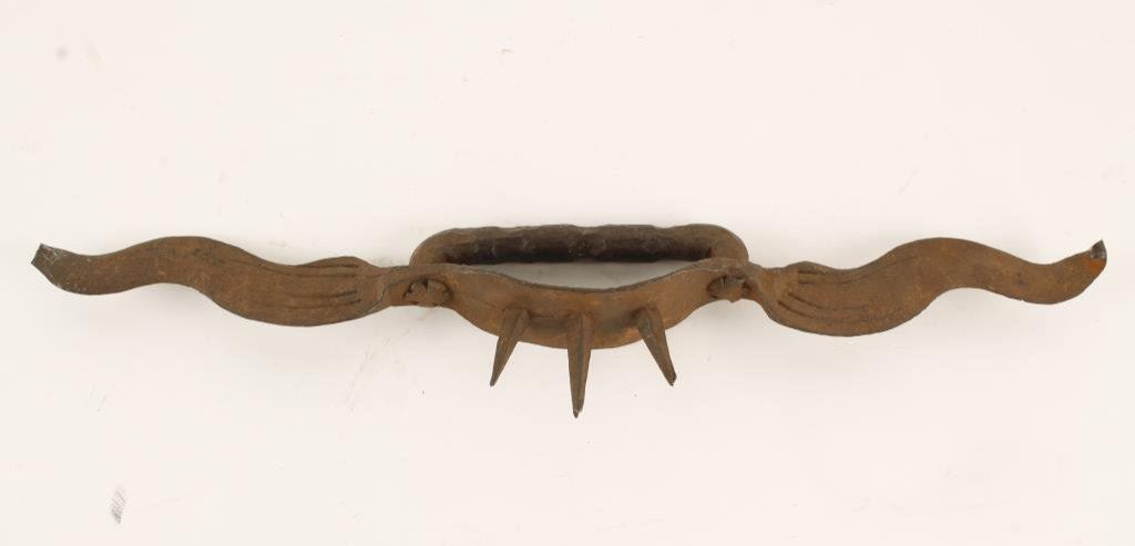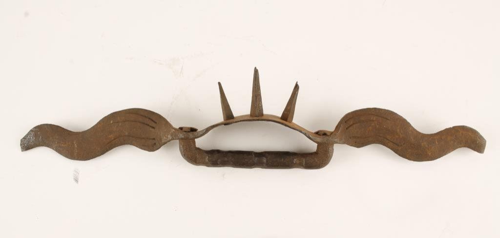 Forged iron three-point knuckle weapon, ca 18th to 19th Century India, approximately 17.5” overall with wavy blades on both sides and three spikes on the center “knuckle” area adjacent to the palm grip bar; overall un-cleaned fair condition with heavy dark patina and slight old end loss to one of the blades. Est.: $200-$400.