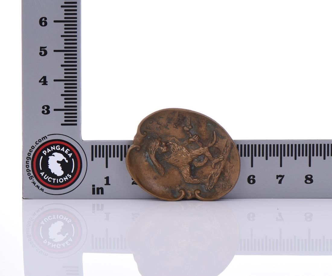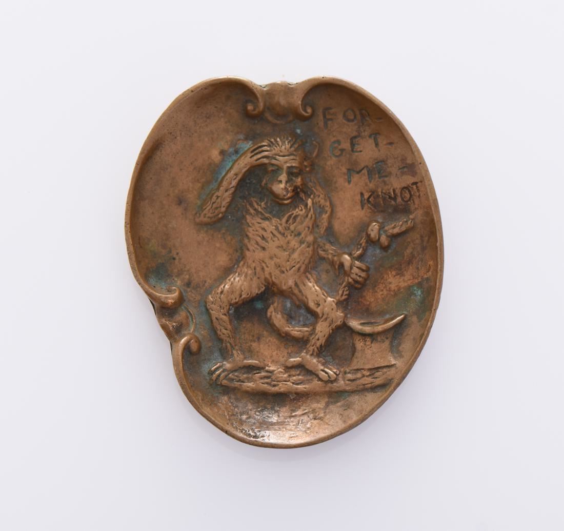 Forget Me Knot Bronze Monkey Ashtray. Estimated more than 75 yrs old. The use of bronze dates from remote antiquity. This important metal is an alloy composed of copper and tin, in proportion which vary slightly, but may be normally considered as nine parts of copper to one of tin. The result is a metal of a rich golden brown color, capable of being worked by casting a process little applicable to its component parts, but peculiarly successful with bronze, the density and hardness of the metal allowing it to take any impression of a mold, however delicate. It is thus possible to create ornamental work of various kinds. The process of casting is known as cire perdue, and is the most primitive and most commonly employed through the centuries, having been described by the monk Theophilus, and also by Benvenuto Cellini. Briefly, it is as follows: a core, roughly representing the size and form of the object to be produced, is made of pounded brick, plaster or other similar substance and thoroughly dried. Upon this the artist overlays his wax, which he models to the degree required in his finished work. Passing from the core through the wax and projecting beyond are metal rods. The modelling being completed, the outer covering which will form the mold has to be applied this is a liquid formed of clay and plaster sufficiently thin to find its way into every detail of the wax model. Further coatings of liquid are applied, so that there is, when dry, a solid outer coating and a solid inner core held together by the metal rods, with the work of art modelled in wax between. Heat is applied and the wax melts and runs out, and the molten metal is poured in and occupies every detail which the wax had filled. When cool, the outer casing is carefully broken away, the core raked out as far as possible, the projecting rods are removed and the object modelled in wax appears in bronze. If further finish is required, it is obtained by tooling. (Wikipedia) Size and weight is provided in the last photo of this lot if not written within the lot description. All photos represent the lot condition and may contain unseen imperfections in addition to the information provided. All items are described to the best of our abilities. Please communicate all questions and concerns prior to bidding. Please read our terms and conditions for more details. Good luck bidding.