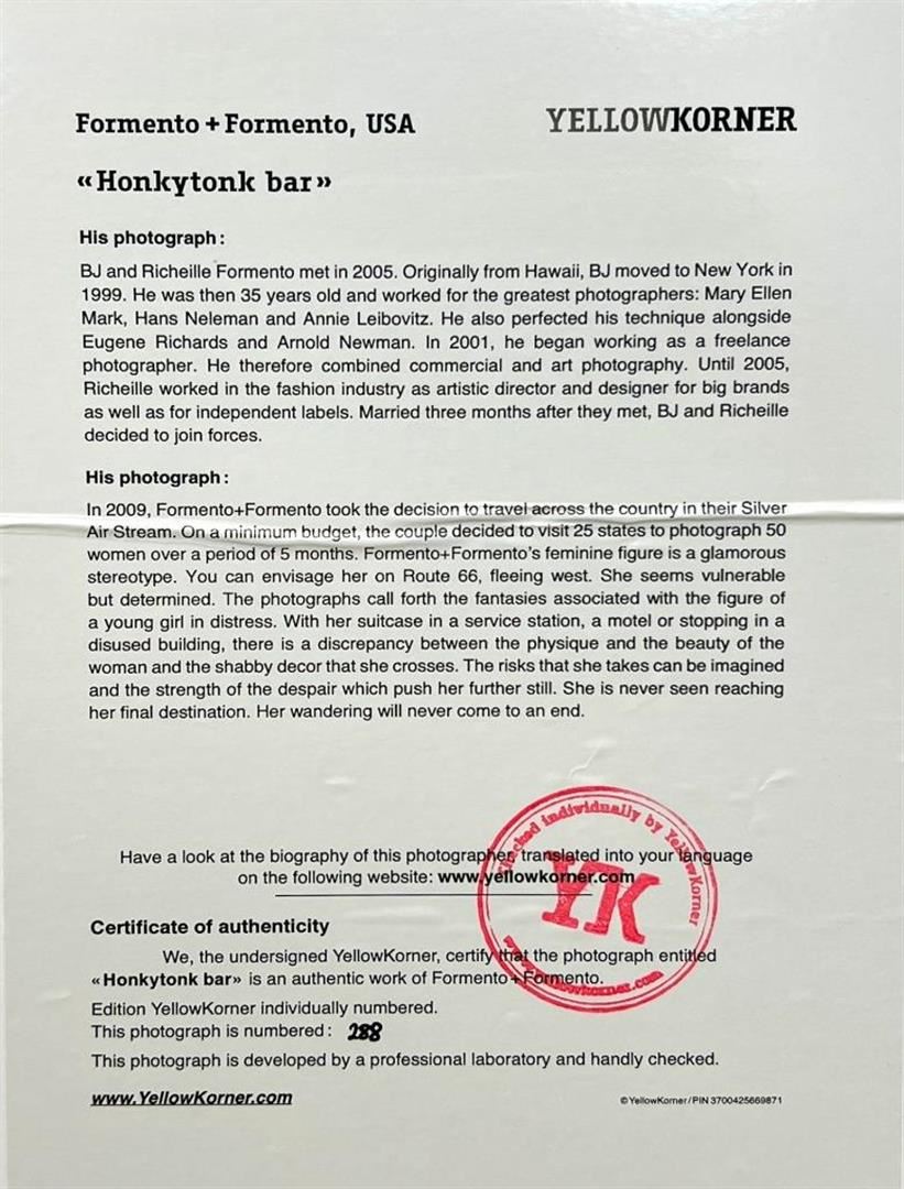 Formento + Formento Usa Honkytonk Bar Singer YellowKorner Certified Photograph. Certificate of Authenticity from YellowKorner affixed to the back. Matted Dimensions 16"x20". Protected with Clear Mylar Sleeve.