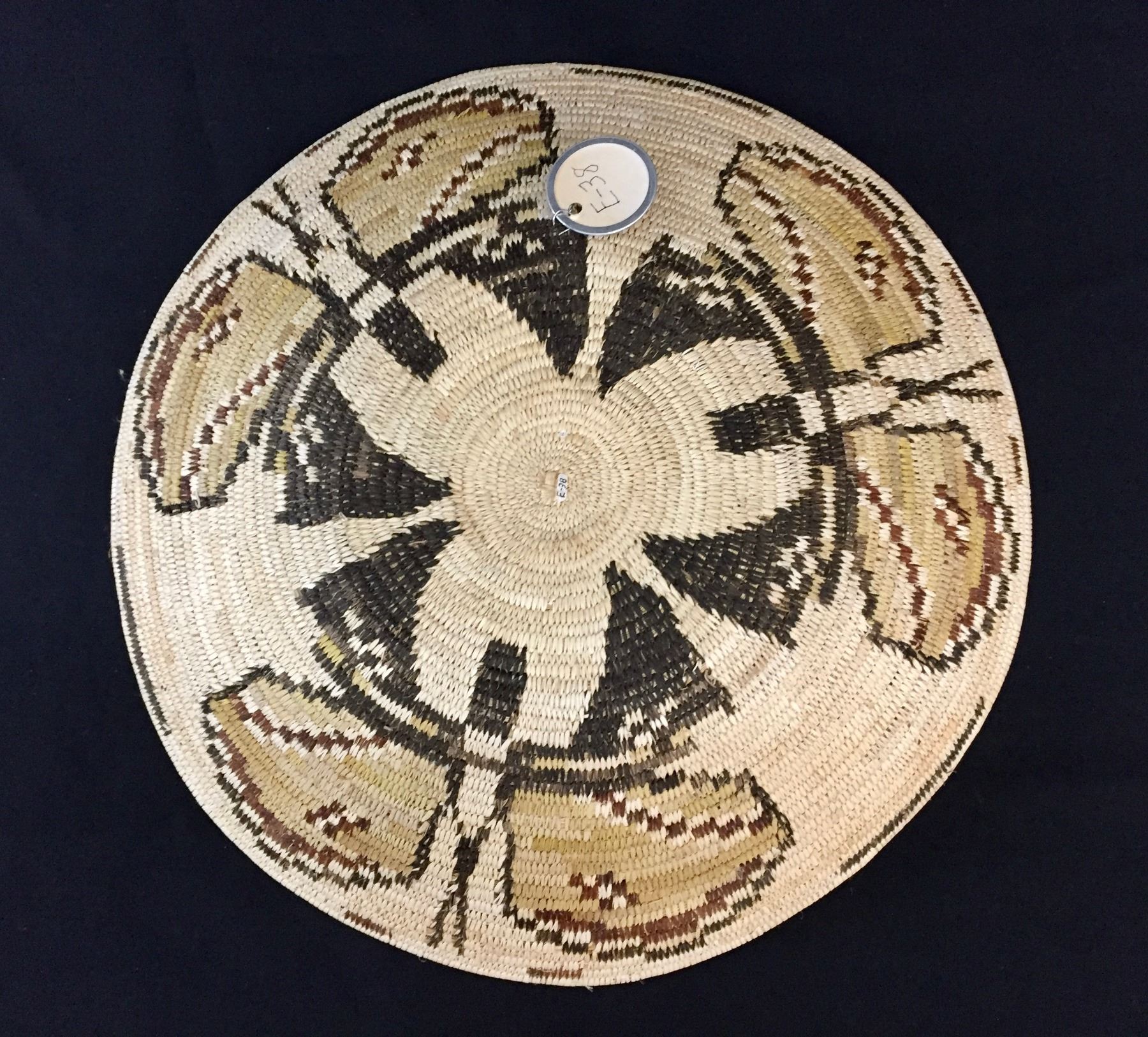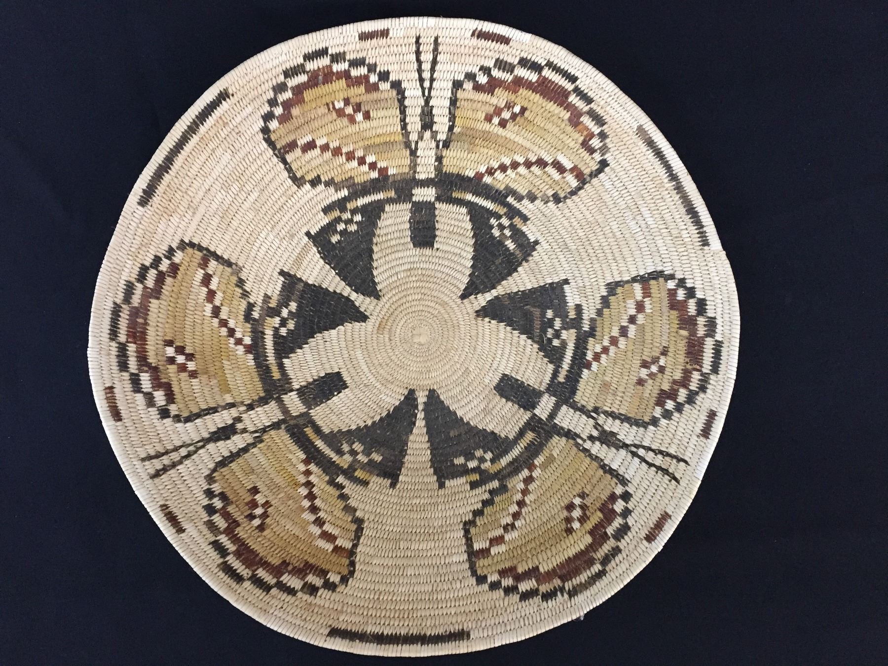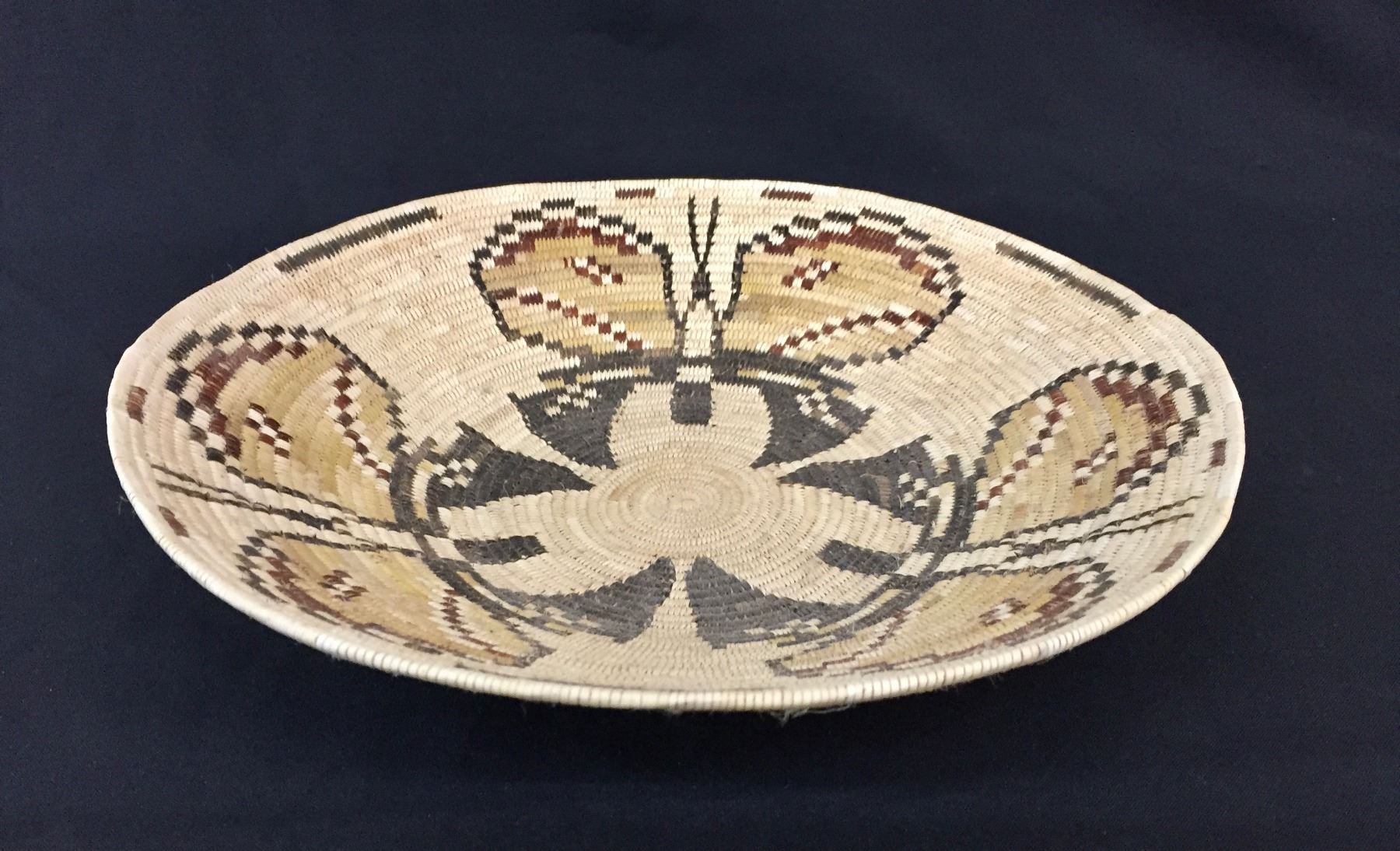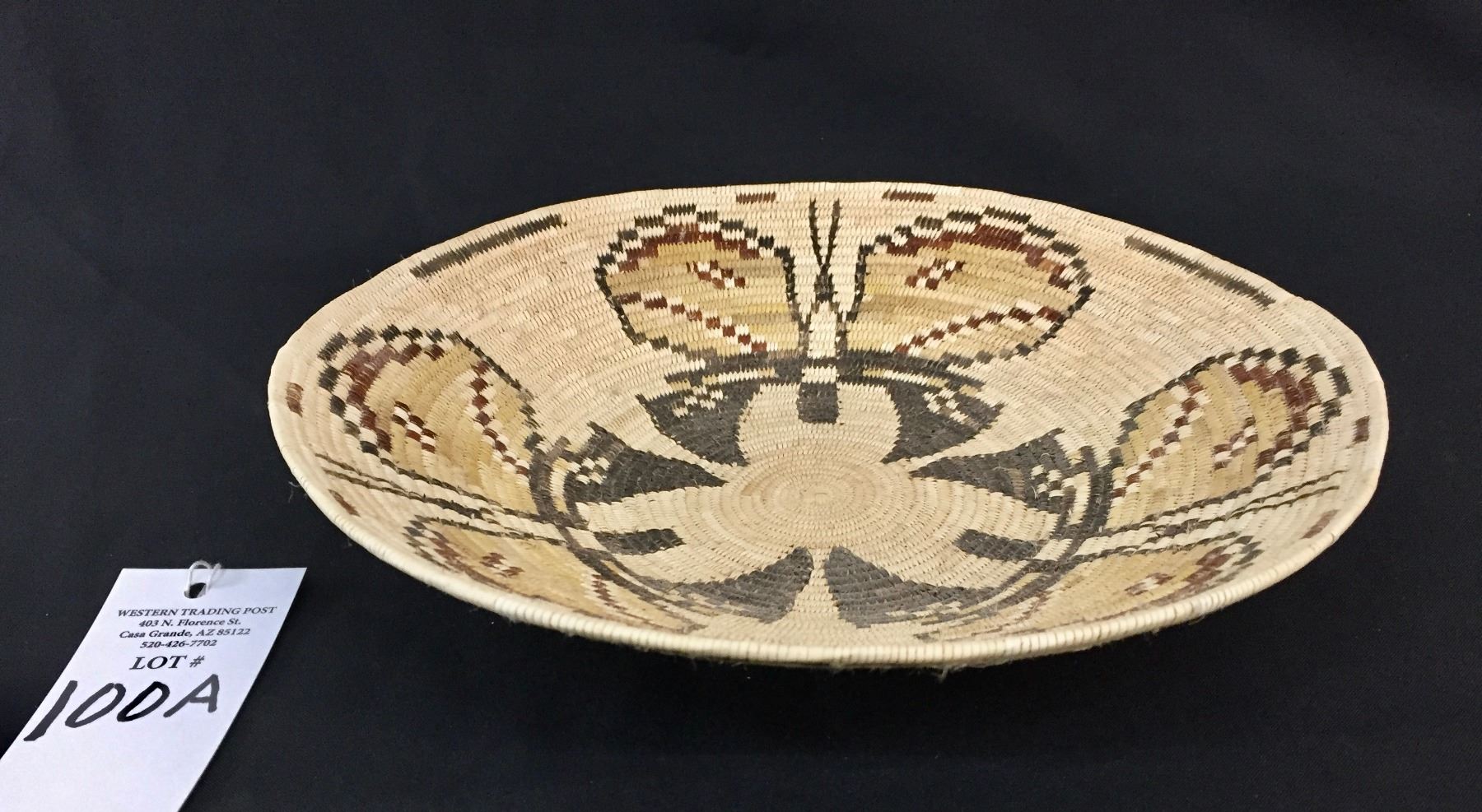 Description: Presented for your consideration we offer for sale this museum quality basket featuring a fine butterfly pattern. This basket was displayed in the Blackwater Museum and originally came from the predecessor to the Blackwater Trading Post, which was the Olberg Trading Post (owned by Ernest and Isabelle Ellis). Maker: Unknown Tohono O’Odham Artist. Approx. Age: Circa 1960s. Size: 11-1/2” round x 2-1/4” deep. Condition: Good for its age, normal wear expected. Please look closely at the pictures - they are an important part of our description. Shipping: There will be a $8 handling / packaging fee for shipping this lot. The actual cost of postage will be added on top of that.