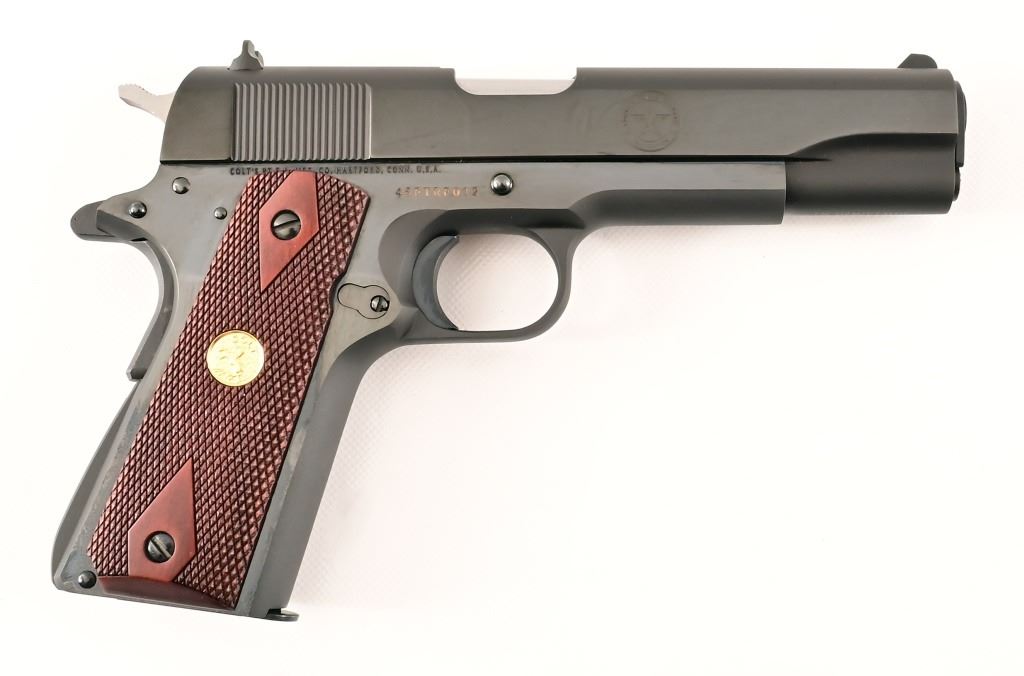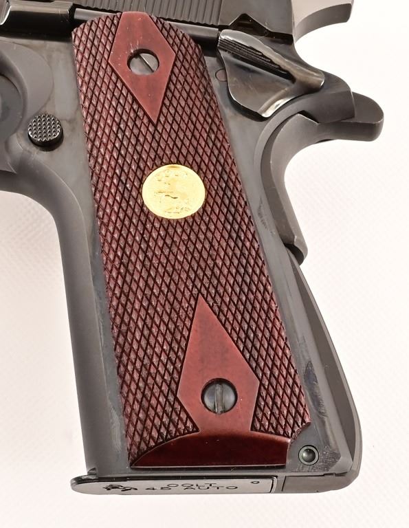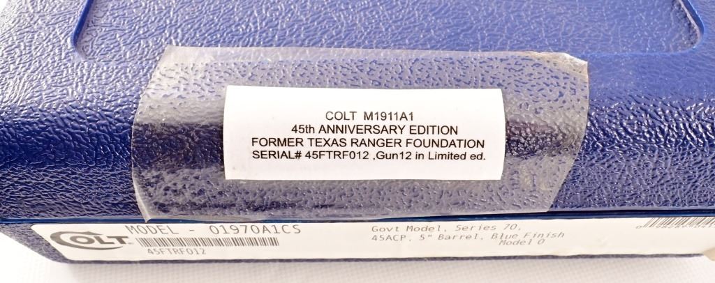 S/N 45FTRF012, manufactured 2017. Former Texas Ranger Foundation 45th Anniversary Colt 1911 Government Model Series 70, number 12 of 100. Blue finish, National Match grade barrel, checkered wood grips. With original Colt blue plastic case.