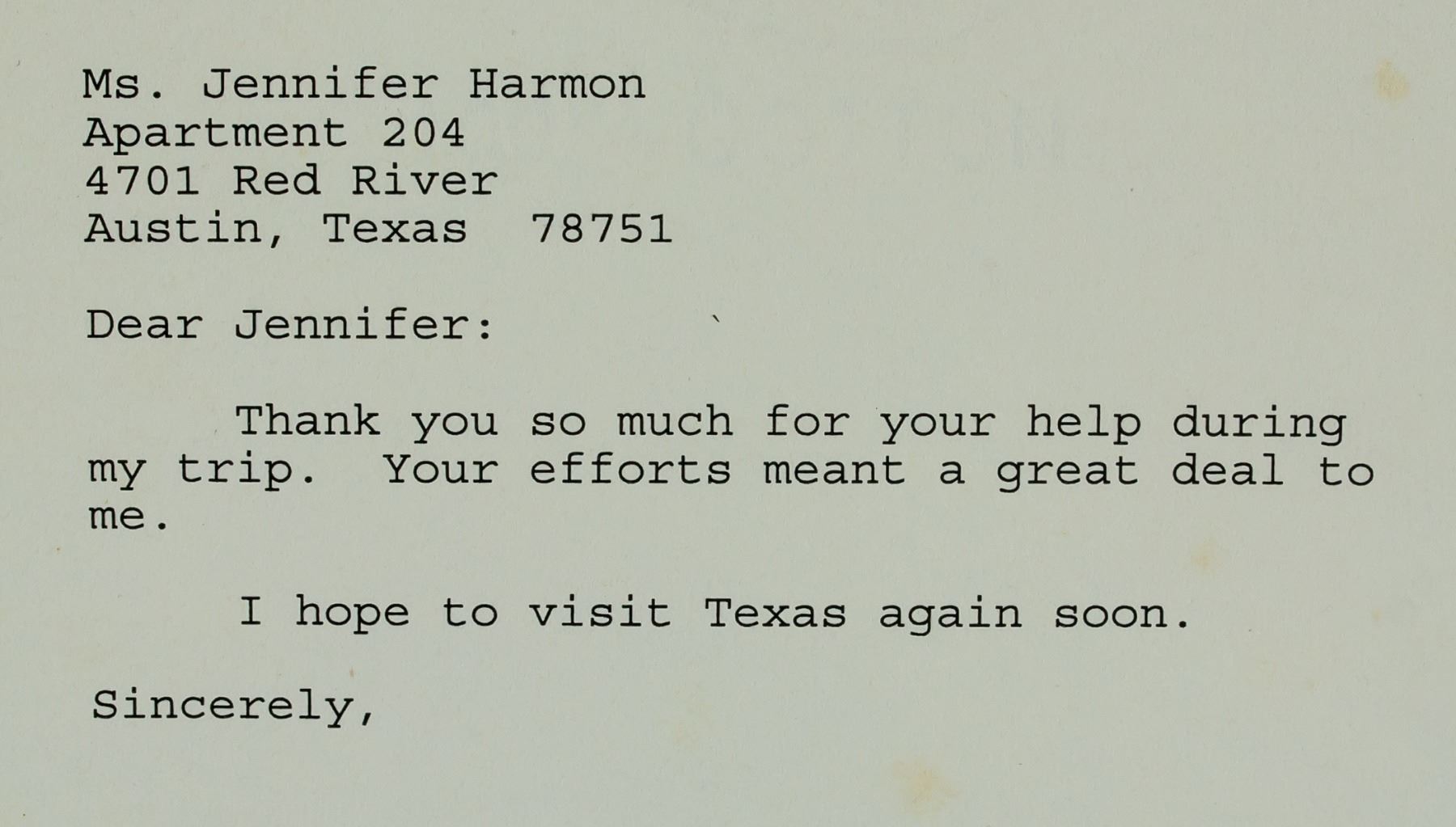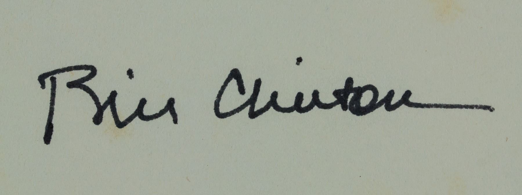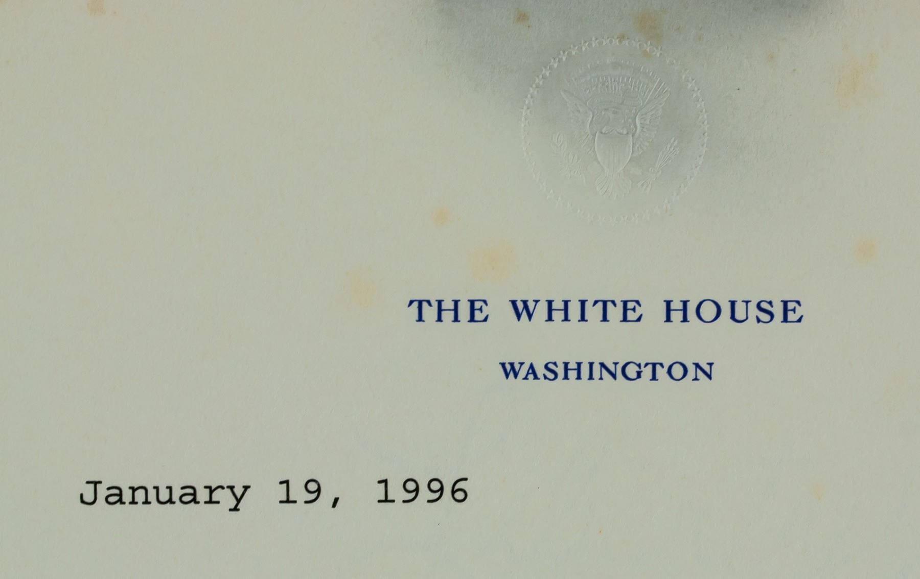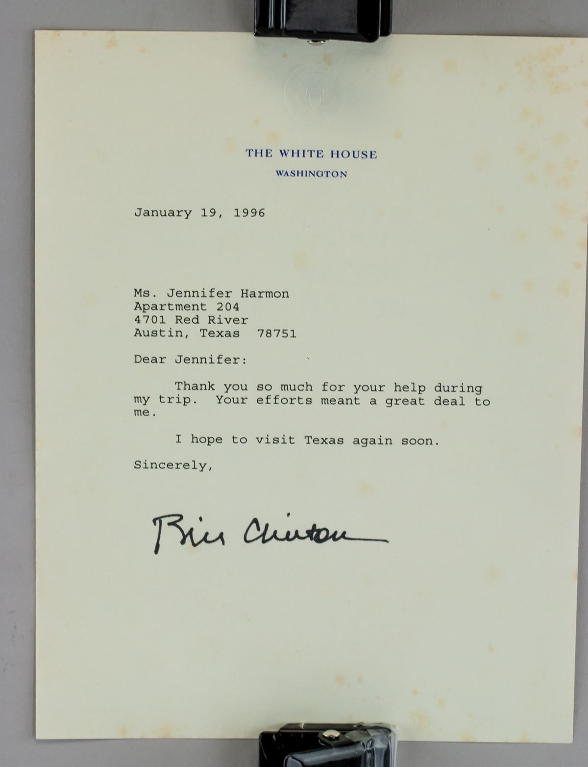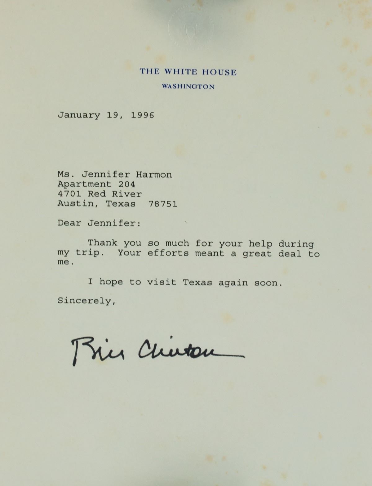 A letter signed by American President Bill Clinton. The letter is composed on the official White House Letterhead with Presidential seal, dated January 19, 1996 and personally addressed to current owner. Addressed to Ms. Jennifer Harmon and inscribed “Dear Jennifer. Thank you so much for your help during my trip. Your efforts meant a great deal to me. I hope to visit Texas again soon.” The letter was received by the current owner and was in response to when she volunteered to drive in a motorcade when Bill Clinton was visiting the University of Texas while she was a current graduate student. The letter accompanied an official White House photograph showing Bill Clinton shaking hands with Jennifer Harmon. Photograph not included in the lot. 22 x 17 cm (8.7 x 6.7 inches). PROVENANCE: Private American collection (Florida, United States).