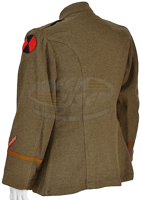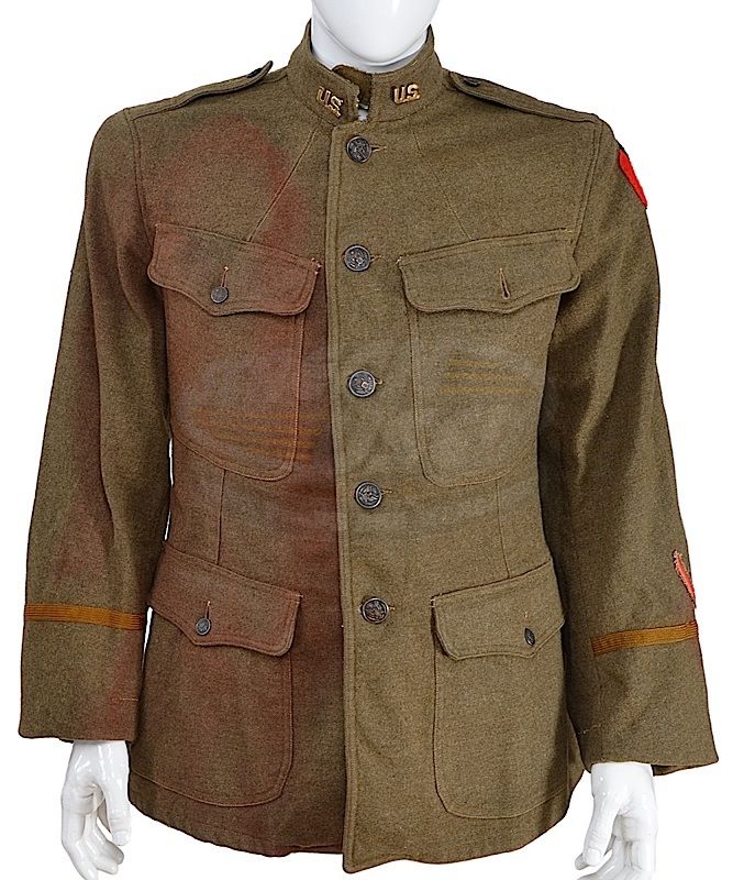 (Paramount Pictures, 1994) This olive green U.S. Army coat with U.S. insignia pins on each collar, 29th infantry wound chevron and officer's braid located on the cuff was acquired by the production for use by Gary Sinise as the grandfather of Lt. Dan. Seen in a flashback scene while Forrest narrates the Taylor family's war service. Minor fading to right front. This jacket comes with a letter of authenticity from the Motion Picture Costume Co., who supplied the wardrobe directly to the production.