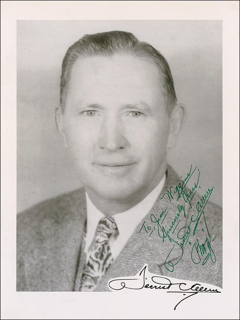 Basketball Hall of Famer (1885–1974). Allen coached 48 seasons at four different colleges, compiling a 746-264 won-loss record. He retired as the all-time winningest coach in collegiate basketball history. Cardstock 8 x 10.5 head-and-shoulders photo, signed and inscribed in green ink “To Jim Wiggins, Sincerely yours, Forrest C. Allen ‘Phog’.” In fine condition.