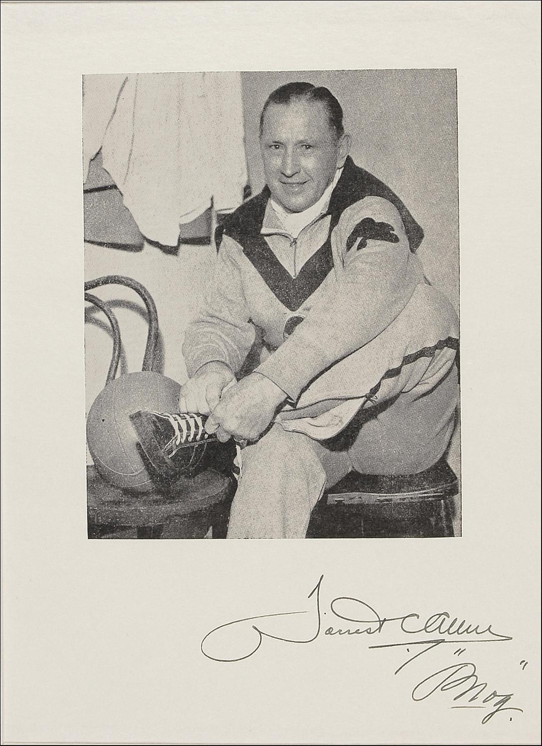 Basketball Hall of Famer. Allen coached 48 seasons at four different colleges, compiling a 746-264 won-loss record. He retired as the all-time winningest coach in collegiate basketball history. His legacy is forever etched into Kansas basketball history. In 39 seasons at KU, Allen won an amazing 590 games, leading Kansas to the 1952 NCAA national championship. Vintage 8 x 10 paperstock photo of Allen lacing up his sneakers, signed in fountain pen, “Forrest Allen, ‘Phog.’” Matted to an overall size of 11 x 14. In fine condition.