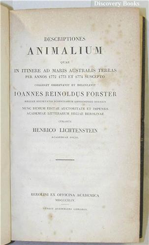 (Forster, Joannes Reinoldus). DESCRIPTIONES ANIMALIUM QUAE IN ITINERE AD MARIS AUSTRALIS TERRAS PER ANNOS 1772 1773 ET 1774 SESCEPTO COLLEGIT OBSERVAIT ET DELINEAVIT. Berlin: Berolini ex Officina Academica 1844 xiii,424pp. plus errata leaf. Modern plain full calf, gilt title on spine.