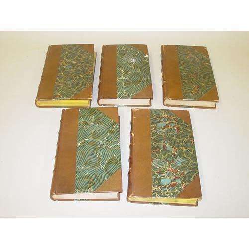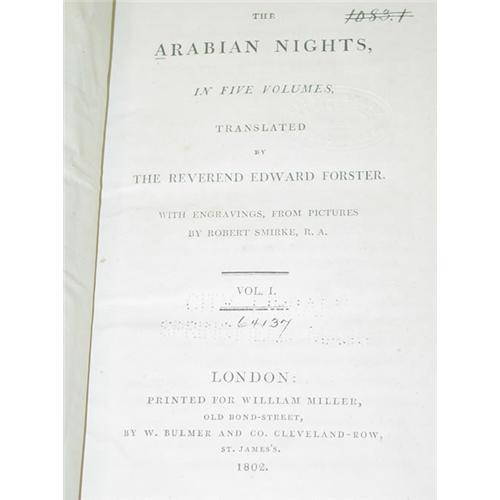 Forster, Reverend Edward [ Translated by]. The Arabian Nights, in Five Volumes. ill. With Engravings, From Pictures By Robert Smirke. London: Printed for William Miller By W. Bulmer and Co., 1802. 8vo - over 7¾" - 9¾" tall. Hard Cover. Ex-Library. Good Condition. All with half-titles & titles, complete with 24 plates as called for. lxi, 1 poem, 1 contents [1] 385pp; 1 contents, [1] 432pp; 1 contents [1] 405pp; 1 contents [1] 461pp; 1 contents [1] 474pp, 1 plate placement [1] 1 errata. Bound in 3/4 leather & marbled paper, raised bands on spine, red & black leather spine labels. BINDINGS & HINGES TIGHT. Occasional foxing, occasional edge/corner wear or bump. Slight variations in the bindings, handwritten note tipped in on half-title of vol. 1. A HANDSOME SET
