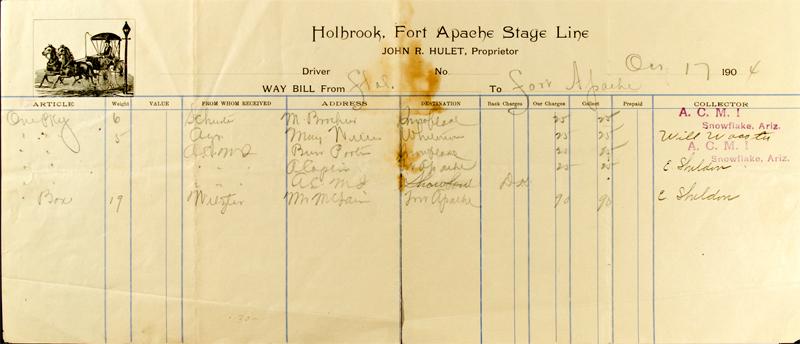 Navajo. Fort Apache. Holbrook, Ft. Apache Stage Line Way Bill. Vignette at top left of a loaded stage coach underway with company name to right and John R. Hulet, Proprietor, printed below company name. Printed in black, blue. The way bill is dated Oct. 17, 1904. Six lines are filled in, indicating six items were shipped. One package was sent from by Schuster to Snowflake for 25c, collected by A.C.M.I.; the second sent by (illegible) to Whiteriver for 25c, collected by Will Wasting; the third-fifth sent by Adams to Snowflake, Fort Apache, and Show Low for 25c each, collected by A.C.M.I. and E. Shildon; and a box sent by Miezter to Fort Apache for 90c, collected by E. Shildon. Measures 16 3/4" x 7 1/4" with 4" tear along the center foldline. Stain at center top. Fine.
