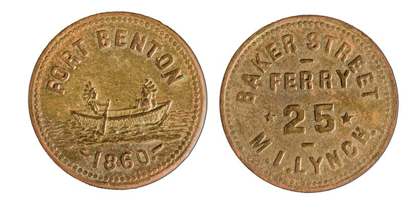 Obverse: Fort Benton/1860; Reverse: Baker Street / Ferry / 25 / M. L. Lynch. Brass, 24mm. Purchased from Hal Dunn in 1974. Rare