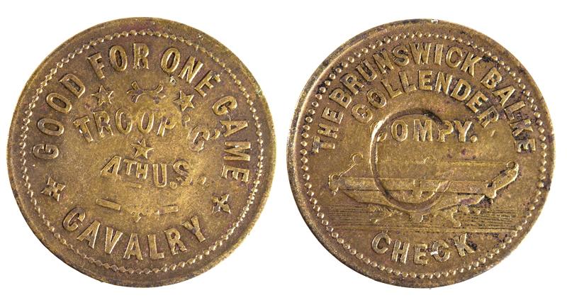 Good for one game, brass Brunswick Balke Collender token. Counterstamped with a "C" on reverse.