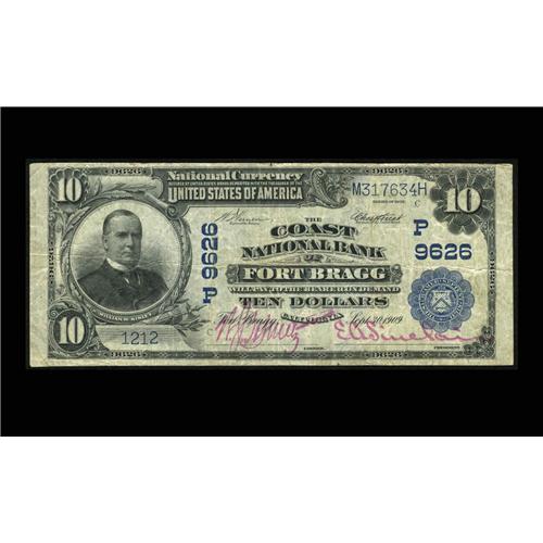 <B>Fort Bragg, CA</B></I> - $10 1902 Plain Back Fr. 626 <B>The Coast NB</B></I> Ch. # (P)9626<BR>The second title used by this very scarce northern California bank. Just three large examples bearing this nomenclature are recorded in the Kelly census, with this piece new to that listing. Bright <B>Fine-Very Fine</B></I> with vivid red signatures, considerably nicer than the Horwedel collection specimen which realized $2990 back in 2004.