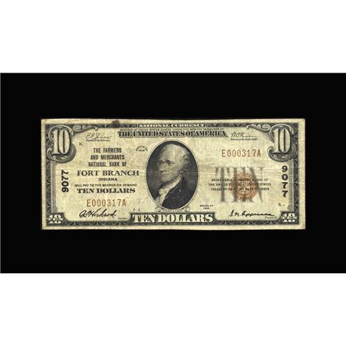 <B>Fort Branch, IN</B></I> - $10 1929 Ty. 1 <B>The Farmers & Merchants NB</B></I> Ch. # 9077<BR>This example is not as interesting as its mismatched prefix sibling, but scarce none the less. Even circulation is only marred by a small spot on the back. <B>Very Good-Fine.</B></I>
