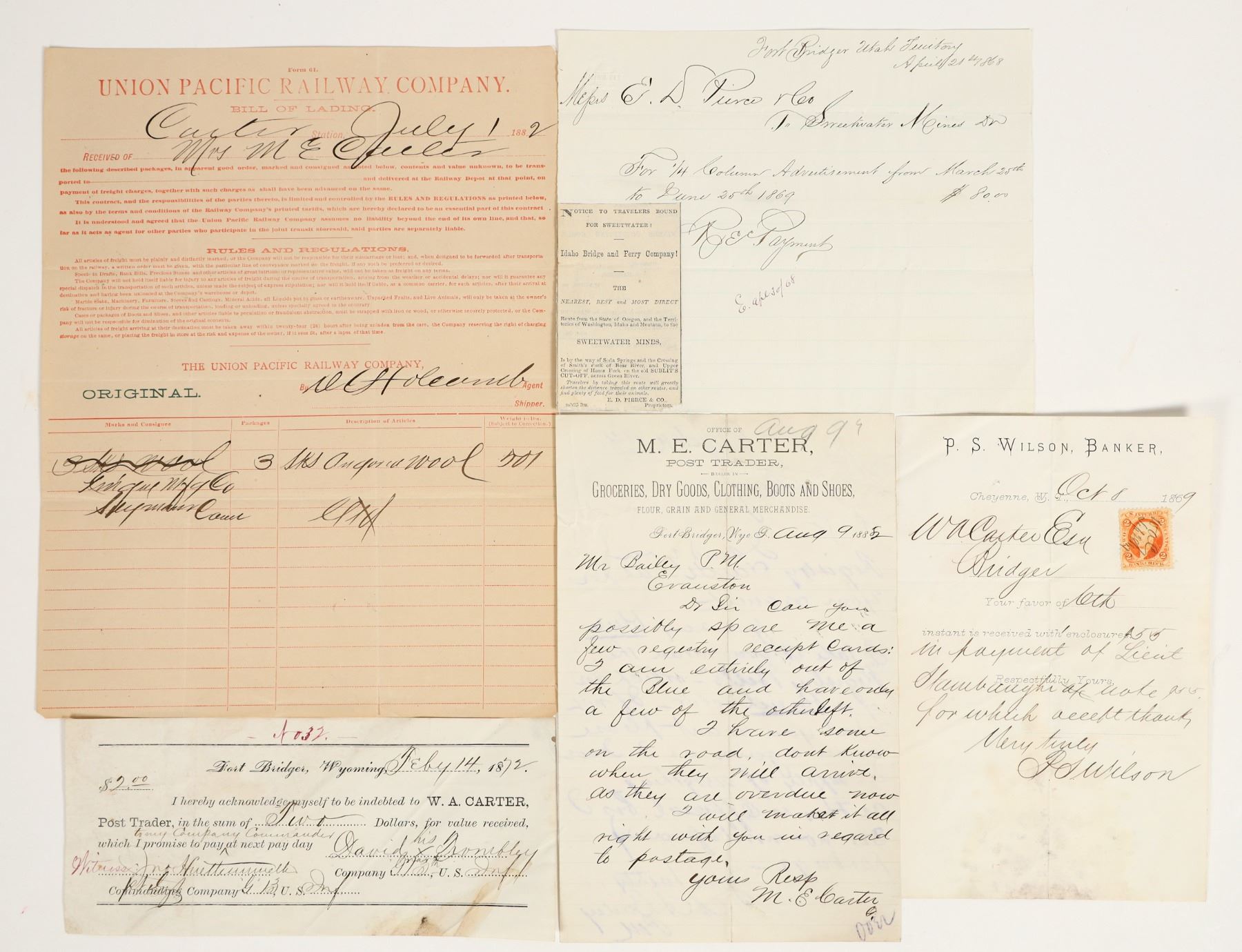 Lot of 6. Rare fort ephemera: ME Carter, Post Trader, 1882 letterhead; 1872 receipt from Company G, 13th Infantry to WA Carter post trader; 1868 manuscript receipt with ad attached for ferry and bridge transport to the Sweetwater Mines by ED Pierce & Co.; 1869 PS Wilson, banker, receipt, Cheyenne, WT to post trader WA Carter; and Union Pacific Railway Co. bill of lading from the Carter station. Fort Bridger was established in 1843 by mountain man Jim Bridger and his partner Louis Vasquez as a trading post for emigrants on the Oregon Trail, Mormon Trail, and California Trail. By the 1850s it became a contested site, first occupied by Mormon settlers and later seized by the U.S. Army during the Utah War of 1857-58. Though originally in Utah Territory, it ended up within Wyoming after the territory's creation in 1868, and today it's preserved as a state historic site.