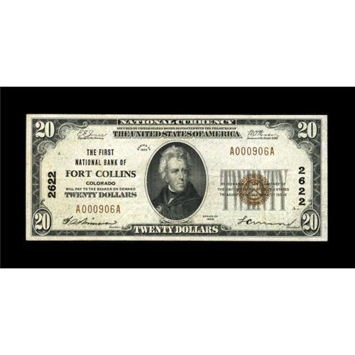 <B>Fort Collins, CO</B></I> - $20 1929 Ty. 1 <B>The First NB</B></I> Ch. # 2622<BR>A problem free <B>Very Fine</B></I> from a sought after Colorado issuer.<BR><BR><b>Shipping:</b> Coin/Currency (<a target="_blank" href="http://www.heritageauctions.com/common/shipping.php">view shipping information</a>)