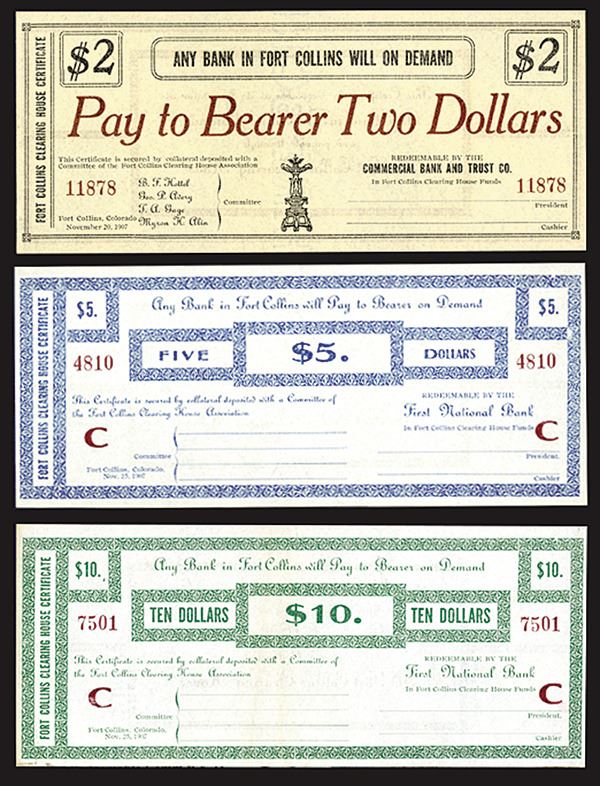 Lot of 3 notes, All are Nov.25, 1907, Fort Collins, Colorado, Panic scrip or currency. Includes $2, S/N 11878, PMG Gem Uncirculated 66 EPQ; $5, S/N 4810, PMG Gem Uncirculated 65 EPQ; and, $10, S/N 7501, PMG Choice Uncirculated 64. Attractive group of scarce Western Panic Currency or Clearing House Certificates from the 1907 financial panic in the U.S.