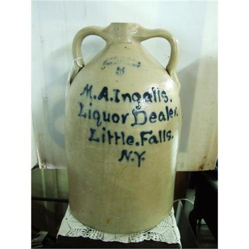 Fort Edward Five Gallon, Two Handled Crock. 19 inches tall, 11 inches in diameter. Made for M.A. Ingall's Liquor Dealer, Little Falls, NY.