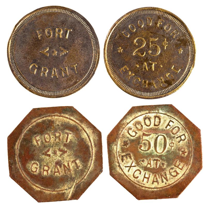 Two tokens: 1) obverse: Fort / Grant; reverse: Good For / 25c / At / Exchange; Br, 27mm, R8, very fine condition; 2) obverse: Fort / Grant; reverse: Good For / 50c / At / Exchange, Br, 29mm, R8, very fine condition.
