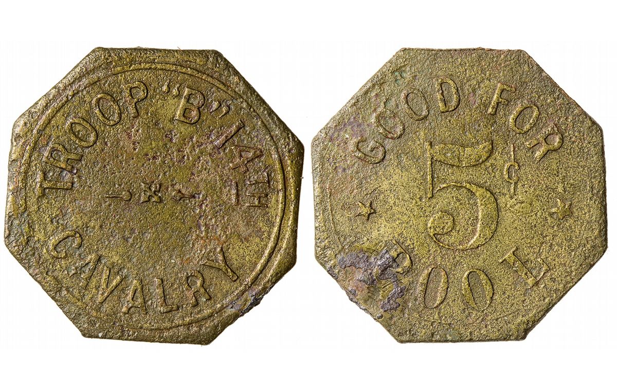 c1902 Military token, Troop "B" 14th Calvary, Good for 5c Pool. Brass, 25mm, octagon, R8. Fort Huachuca was originally established in 1877 to fight the Chiricahua. It is situated in the very southern end of Arizona, about 15 miles from the Mexican border. Geronimo surrendered here in 1886. In 1913, it bcame home to the 10th Cavalry "Buffalo Soldiers." It was decalred a historic landmark in 1976. Bud Bassett Collection - HKA#65317
