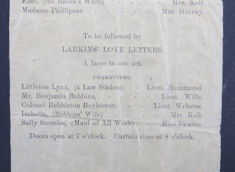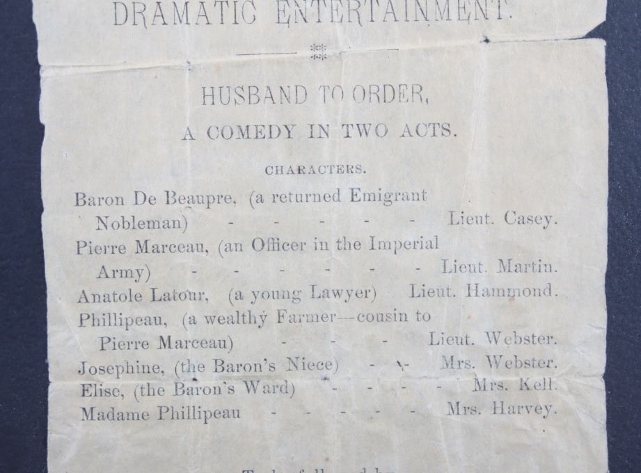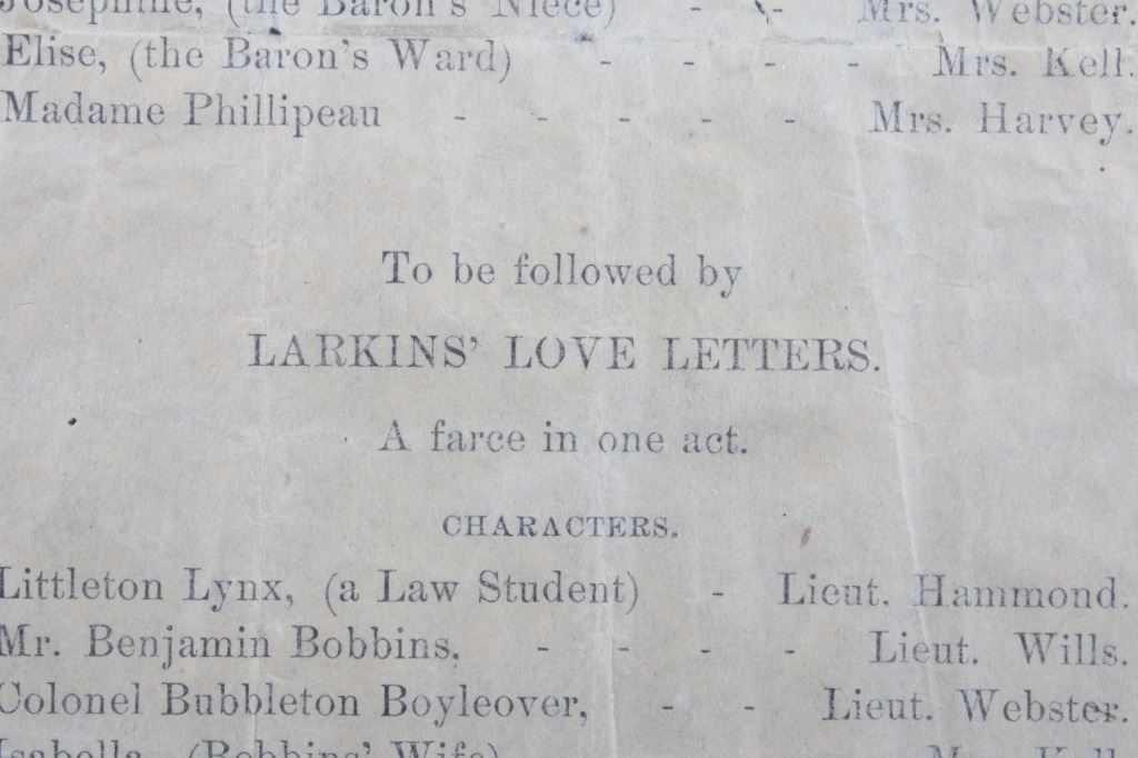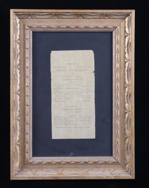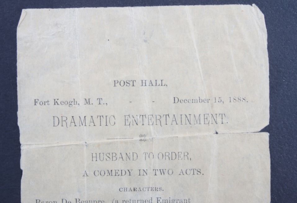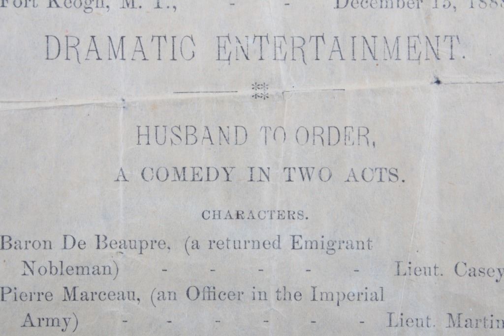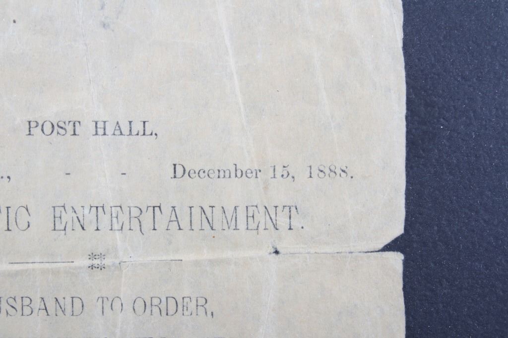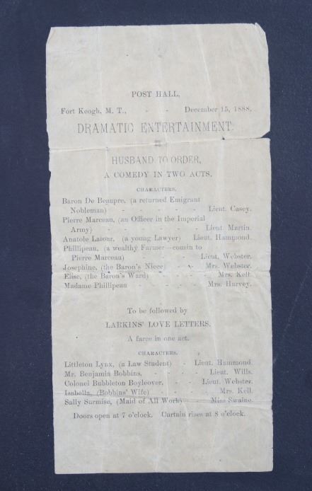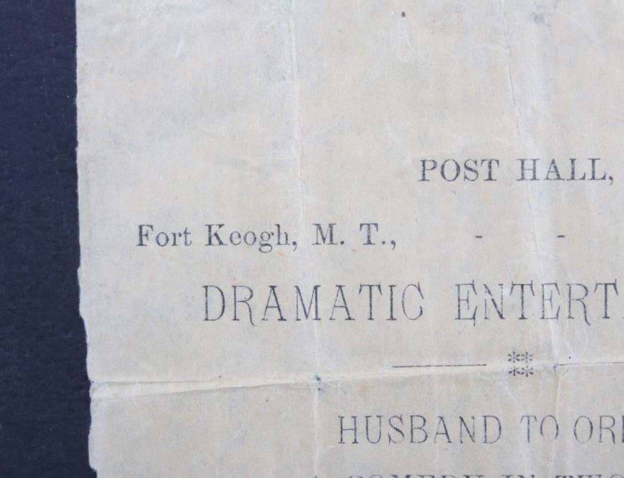 Featured in this lot we have a Fort Keogh Montana Territory Dramatic Entertainment theater advertisement, originating from 1888. The piece is marked across the top "Post Hall, Fort Keogh, M. T., December 15, 1888 Dramatic Entertainment". The piece details two upcoming plays: "Husband to Order- A Comedy in Two Acts" and followed by "Larkins' Love Letters- A Farce in one act". The advertisement shows the names of the characters for each play and the actors for each part. The piece is set into a custom, wooden frame with a black border around the program. The notice shows good condition for its age, with some light wear. The frame measures 11 3/4" wide by 16" tall with the paper measuring 4 1/4" wide by 8 1/2" tall.