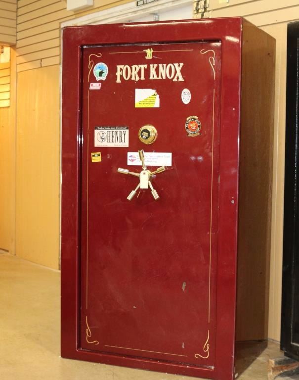 Premium Fort Knox gun safe with combination lock measuring 66 1/2"H x 36 3/4"W x 26 1/2"D. Safe is maroon in color and has a 50 minute burn time. Interior is nicely carpeted, including the shelves. Overall condition is good.
