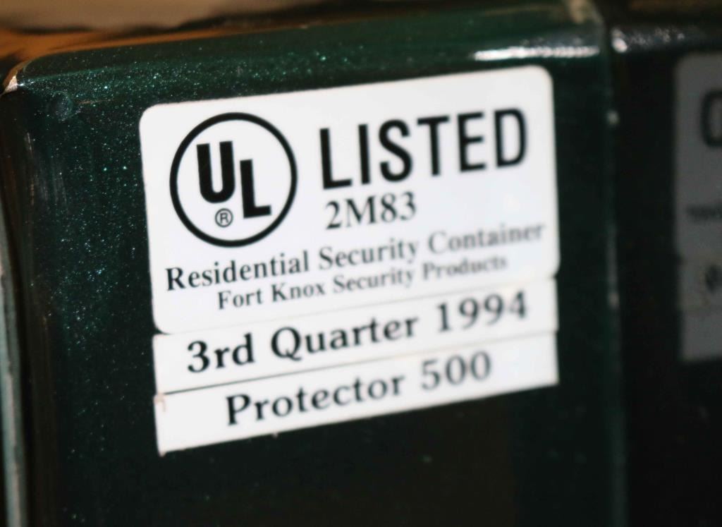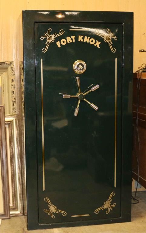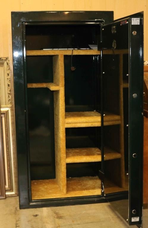 Green gun safe with gold front lettering and gold and silver two tone wheel. Third quarter 1944 Protector 500. Four shelves, rifle rack can hold 12 long guns has key. Combination is 80 20 60. Measures 60 3/8"h x 30 1/2"w x 24 1/2"d.