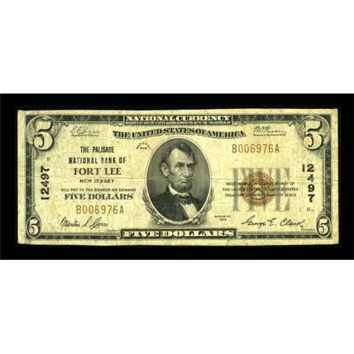<B>Fort Lee, NJ</B></I> - $5 1929 Ty. 1 <B>The Palisade NB</B></I> Ch. # 12497<BR> Just seven small size notes are listed in the census. This is a pleasing <B>Fine</B></I> example from a small community literally in the shadow of the George Washington Bridge connecting New York with New Jersey.<BR><BR><b>Shipping:</b> Coins & Currency (<a target="_blank" href="http://www.heritageauctions.com/common/shipping.php">view shipping information</a>)