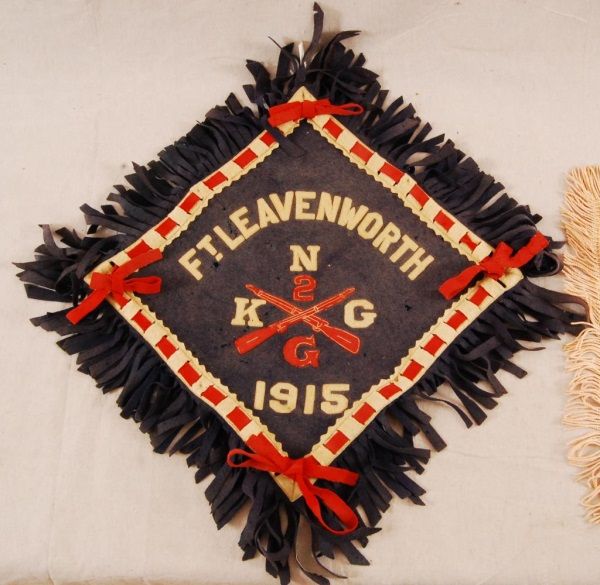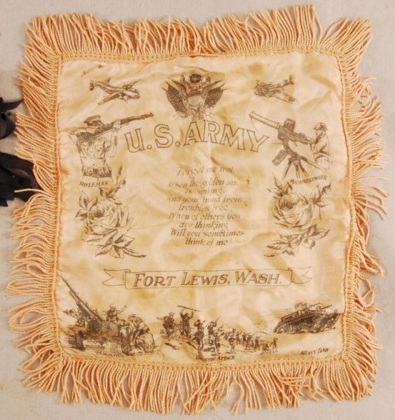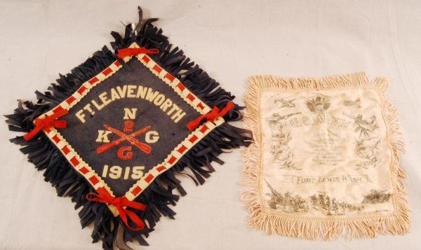 Pillow sham from Fort Lewis Washington. Early 20th century. Together with Fort Leavenworth Banner dated 1915. Some mothing.