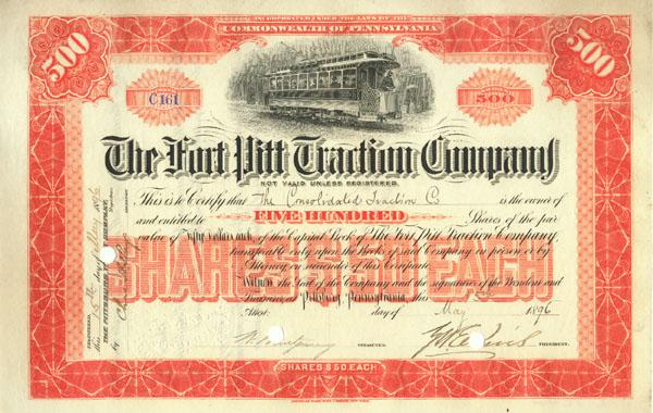 1896. Pennsylvania. Stock certificate for 500 shares. Orange/Black. Vignette of electric streetcar at top center. Punch cancelled. Very fine.