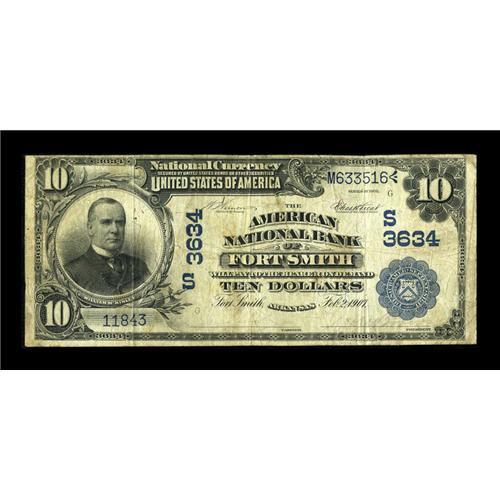 <B>Fort Smith, AR</B></I> - $10 1902 Date Back Fr. 618 <B>The American NB</B></I> Ch. # (S)3634<BR>A decent Third Charter Date Back from this less often seen Fort Smith bank. <B>Fine.</B></I><BR><BR><b>Shipping:</b> Coins & Currency (<a target="_blank" href="http://www.heritageauctions.com/common/shipping.php">view shipping information</a>)