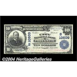 Fort Smith, AR - $10 1902 Plain Back Fr. 631 The City NB Ch. # (S)10609Nice red stamped signatures and decent margins enhance the appeal of this attractive Ten from this less common Fort Smith bank. Very Fine-Extremely Fine. <BR><BR><B>Important notice:</B> Heritage usually auctions material at the rate of 200-250 lots per hour. On some occasions eBay Live bid software or the Internet may not be able to keep up with the pace of the auction. We recommend placing a realistic absentee bid now as insurance to avoid disappointment. Occasionally the auctioneer may eliminate or reject an eBay Live bid, and the auctioneer may also reopen a lot after the close of the eBay live bidding (usually because we missed an audience bid), and may reject your bid even if it shows you as the winning bidder. By bidding via eBay Live, you agree that Heritage may award the lot to another bidder at its sole discretion under the circumstances described above or any other reasonable circumstances. Since eBay bids are not shown to us until we open the lot on the floor, we treat those bids just like floor bids. In most cases the floor responds before the eBay bid is presented to us, due to Internet lag time, so for consistency we have made it a policy that floor bids are always considered first over tie eBay live bids. Also please note that all Heritage lots purchased through eBay Live carry a 20% Buyer's Premium. Please make sure you read the Terms and Conditions before you bid. <BR><BR><B>IMPORTANT ANNOUNCEMENT ABOUT RESERVES:</B> Heritage now divulges all reserves on its web site 7 days before every auction. If you want to know whether the reserve on this lot has been met, and if not, what the reserve amount is, please visit this lot page on the HeritageCoin.com web site, or email: bid@HeritageGalleries.com