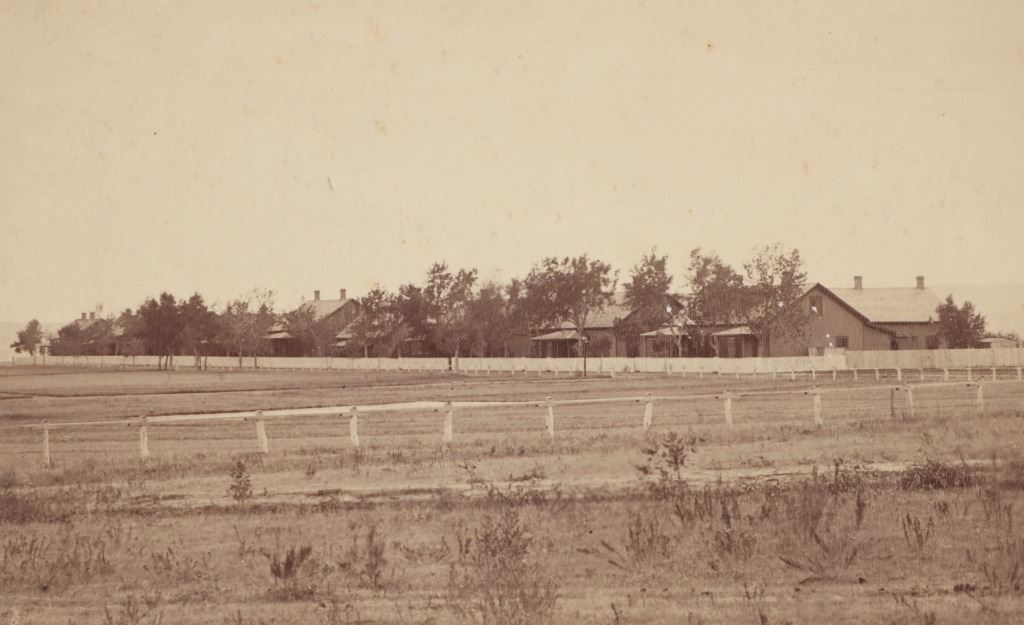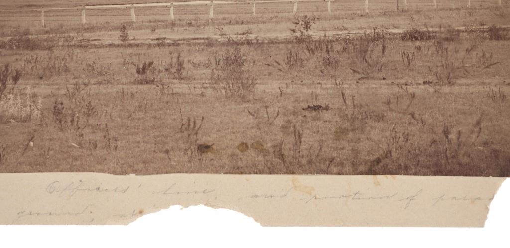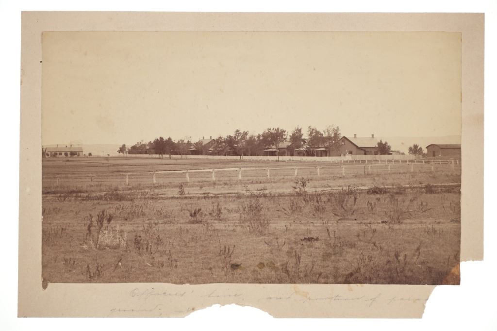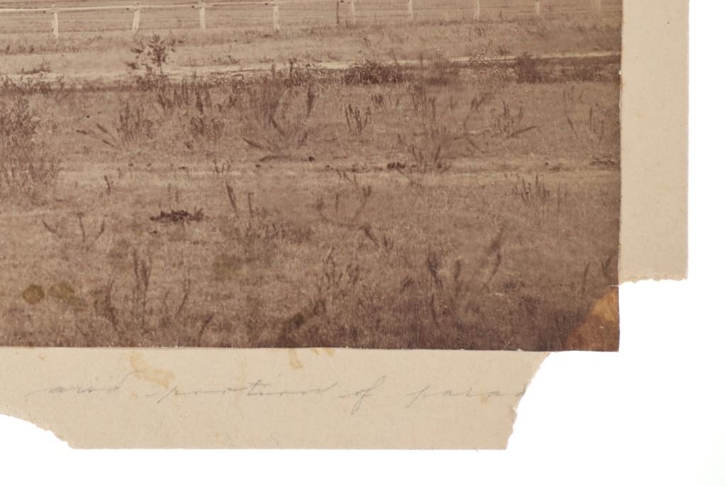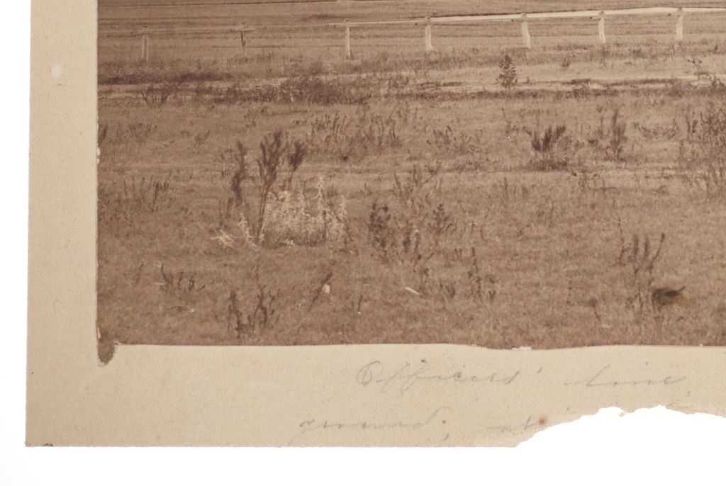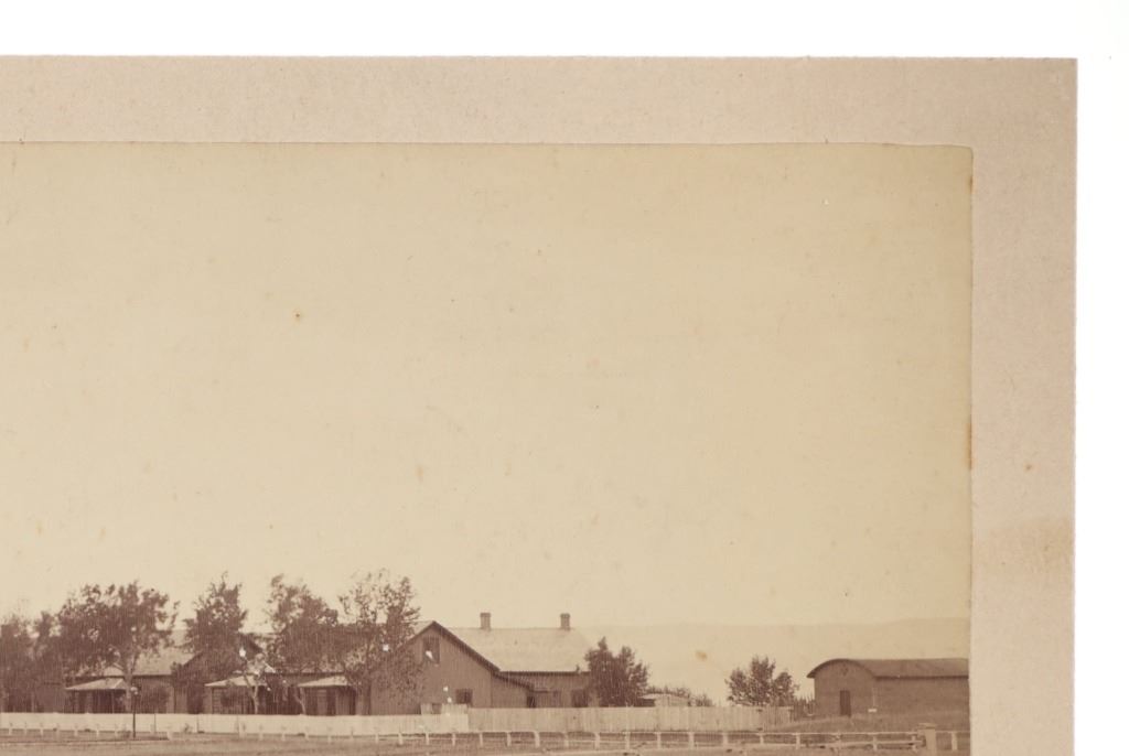 Featured in this lot is this Fort Sully South Dakota Officers Row and Parade Grounds boudoir card circa 1866-1894. This is both a rare and unseen image of Fort Sully during the Indian Wars by a noted photographer of the area. The boudoir card features a wonderfully and professionally crafted card and silver albumen construction that shows the officers row and parade grounds of Fort Sully with buildings in the distance. The boudoir card is marked on the front and the back as follows: Officers Row and Parade Grounds at Fort Sully - Andover. The condition of this boudoir card shows some rips to the card and a piece missing out of the bottom of the card and to the bottom right corner with very little fading to the photograph due to age but otherwise is preserved. The measurements of this boudoir card is 5 3/4" x 8 3/4".
