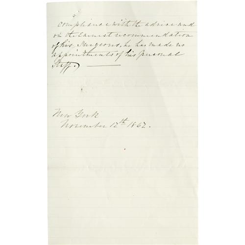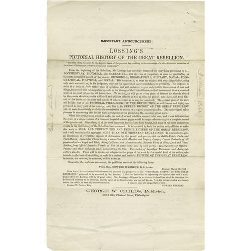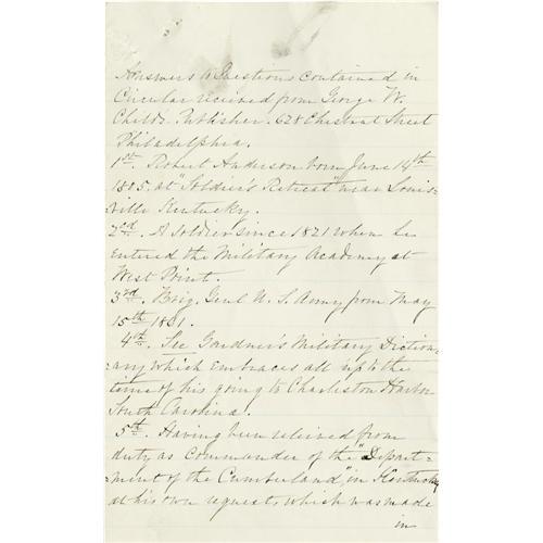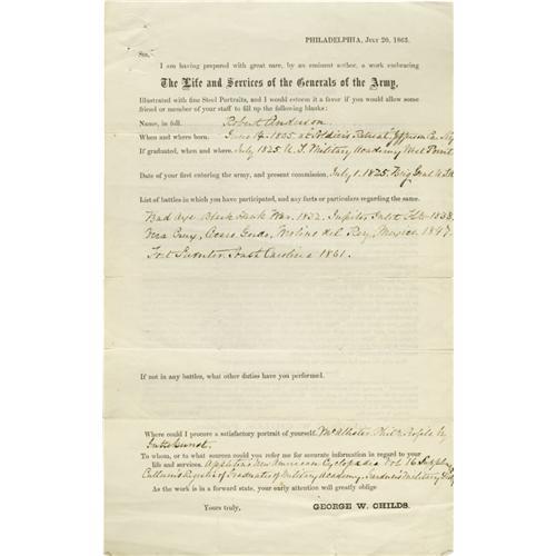 <B>Fort Sumter General Robert Anderson Fills Out 1863 Questionnaire</B></I> Partly Printed DS: "<I>Robert Anderson</B></I>", One page, 8" x12.5". Printed letter, in questionnaire form, from George W. Childs to Robert Anderson. Anderson has filled out the questionnaire with the first answer being his signature. In full (Anderson's handwritten replies in italics): "Philadelphia, July 20, 1863. Sir, I am having prepared with great care, by an eminent author, a work embracing 'The Life and Services of the Generals of the Army,' Illustrated with fine Steel Portraits, and I would esteem it a favor if you would allow some friend or member of your staff to fill up the following blanks: Name, in full. <I>Robert Anderson.</B></I> When and where born.<I>June 14. 1805. at 'Soldier's Retreat. Jefferson Co., Ky.</B></I> If graduated, when and where. <I>July 1825. U.S. Military Academy West Point</B></I> Date of your first entering the army, and present commission. <I>July 1, 1825. Brig Genl U.S.A.</B></I> List of battles in which you have participated, and any facts or particulars regarding the same. <I>Bad Axe Black Hawk War. 1832. Jupiter Inlet Fla 1838. Vera Crux (sic), Cerro Gordo, Molino del Rey, Mexico. 1847. Fort Sumter. South Carolina 1861.</B></I> If not in any battles, what other duties have you performed. [left blank] Where could I procure a satisfactory portrait of yourself. <I> McAllister. Phila Profile by Guttekunst.</B></I> To whom, or to what sources could you refer me for accurate information in regard to your life and services. <I> Appleton's New American Cyclopedia Vol 16 Supplement, Cullum's Register of Graduates of Military Academy. Gardner's Military Dicty.</B></I> As the work is in a forward state, your early attention will greatly oblige Yours truly, George W. Child." On verso is a printed announcement for "Lossing's Pictorial History of the Great Rebellion". Slight tears in blank areas at edges of folds, else in fine condition. Accompanied by manuscript biographical information relating to Anderson, 1.5p, 5" x 8", dated November 12, 1862. This was part of the renowned Collection of Oliver R. Barrett sold at Parke-Bernet Galleries in New York on February 20, 1952; original Parke-Bernet folder is present. Three items. From the Henry E. Luhrs Collection.