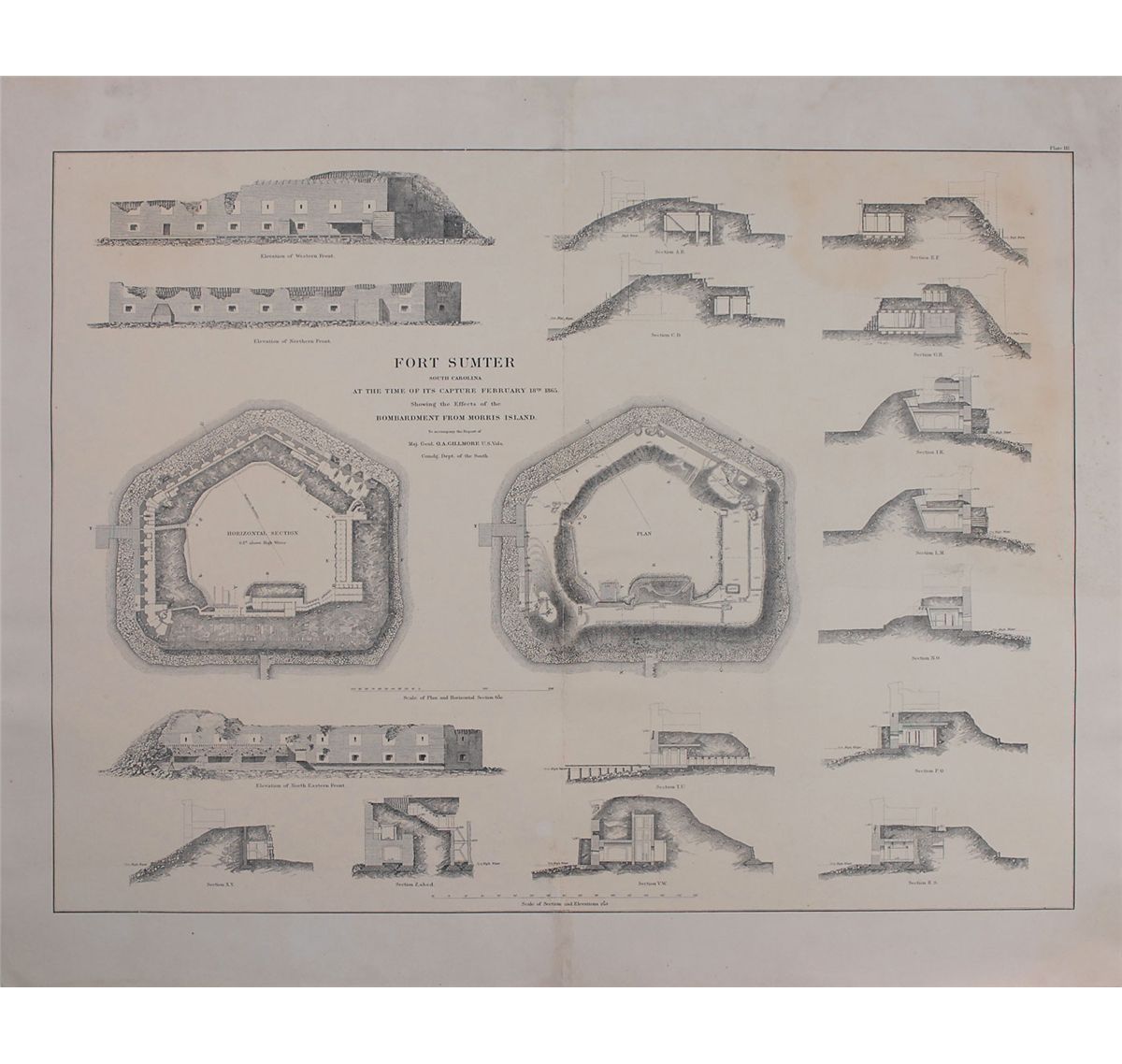 A large and very detailed engraving, 34 x 27.5, titled “Fort Sumter, South Carolina at the time of its capture February 18th, 1865. Showing the effects of the bombardment from Morris Island To accompany the report of Maj. Genl. Q. A. Gillmore, U.S. Vols., comdg. Dept. of the South.” Engraving features a 1/600 scale plan and matching horizontal section detailing the layout of the fort together with three 1/240 scale elevations as well as thirteen vertical sections. In areas where the destruction of the fort was near complete, the illustrator has added dotted lines to show the outline of the original structure. In very good condition, with a professional repair to a total central vertical separation, small area of repaired paper loss along top edge, and some scattered light foxing and soiling to borders.