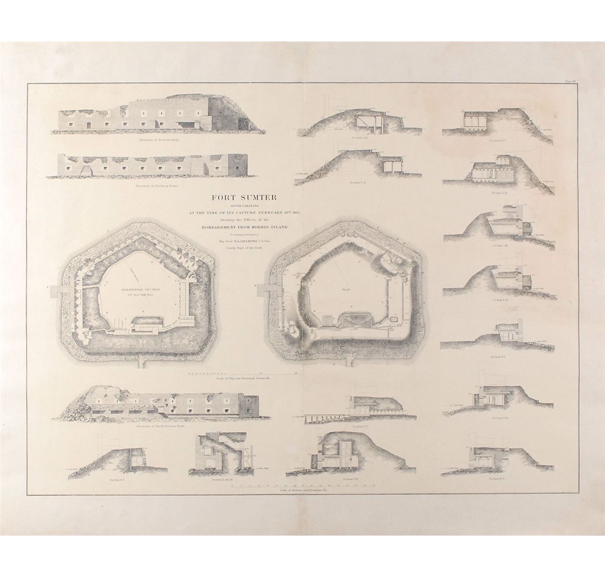 A large and very detailed engraving, 34 x 27.5, titled “Fort Sumter, South Carolina at the time of its capture February 18th, 1865. Showing the effects of the bombardment from Morris Island To accompany the report of Maj. Genl. Q. A. Gillmore, U.S. Vols., comdg. Dept. of the South.” Engraving features a 1/600 scale plan and matching horizontal section detailing the layout of the fort together with three 1/240 scale elevations as well as thirteen vertical sections. In areas where the destruction of the fort was near complete, the illustrator has added dotted lines to show the outline of the original structure. In very good condition, with a professional repair to a total central vertical separation, small area of repaired paper loss along top edge, and some scattered light foxing and soiling to borders.