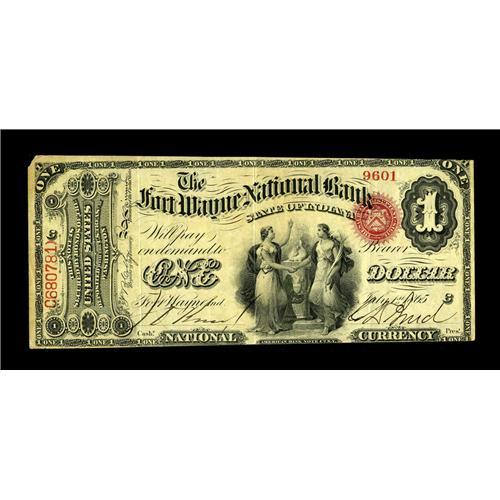 <B>Fort Wayne, IN</B></I> - $1 Original Fr. 380 <B>The Fort Wayne NB</B></I> Ch. # 865<BR>This otherwise <B>Extremely Fine</B></I> Ace becomes only the second note known from this issuer, which ceased operations in 1885, after emitting only First Charter designs. The last public offering from here was likely this note, rather than its VG-F colleague, from a Lowell Horwedel 1979 price list at $400. We do note that the top and bottom margins are slightly trimmed in and that a small chink, wholly outside the design, is missing at the upper left corner, but expect that the rarity and eye appeal of this attractive appearing Ft. Wayne rarity will result in a realization in the range of...<BR><BR><b>Shipping:</b> Coin/Currency (<a target="_blank" href="http://www.heritageauctions.com/common/shipping.php">view shipping information</a>)