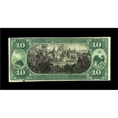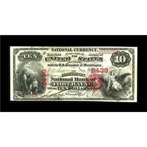 <B>Fort Wayne, IN</B></I> - $10 1875 Fr. 419 <B>The Hamilton NB</B></I> Ch. # 2439<BR>Flamboyant pen signatures are quickly noticed on this lightly handled $10. The red overprint is dark and this has resulted in bleed through for this eye appealing note. We would be remiss if we did not mention that at Memphis 2005 another Fr. 419 on this bank in a much lower grade brought over $1800. <B>Extremely Fine.</B></I><BR><BR><b>Shipping:</b> Coin/Currency (<a target="_blank" href="http://www.heritageauctions.com/common/shipping.php">view shipping information</a>)
