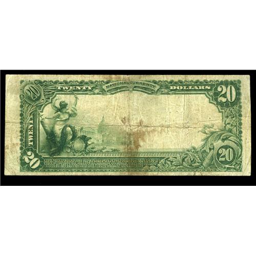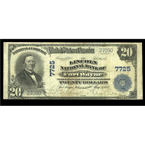 <B>Fort Wayne, IN</B></I> - $20 1902 Plain Back Fr. 658 <B>The Lincoln NB</B></I> Ch. # 7725<BR>Here is another bank that felt the pressure of having "German" in its name, changing to this title in 1918. The note is complete with a tight bottom margin and a wallet stain that shows more on the back. <B>Fine.</B></I>