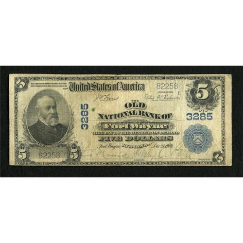 <B>Fort Wayne, IN</B></I> - $5 1902 Plain Back Fr. 598 <B>The Old NB</B></I> Ch. # 3285<BR> Nice signatures of Stephan Morris and Henry C. Paul prevail on this $5 from the Hoosier State. A couple of pinholes are noticed. <B>Very Good</B></I>.<BR><I>From The John Ameen Collection</B></I><BR><BR><b>Shipping:</b> Coins & Currency (<a target="_blank" href="http://www.heritageauctions.com/common/shipping.php">view shipping information</a>)